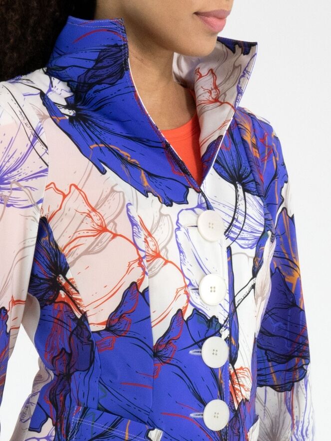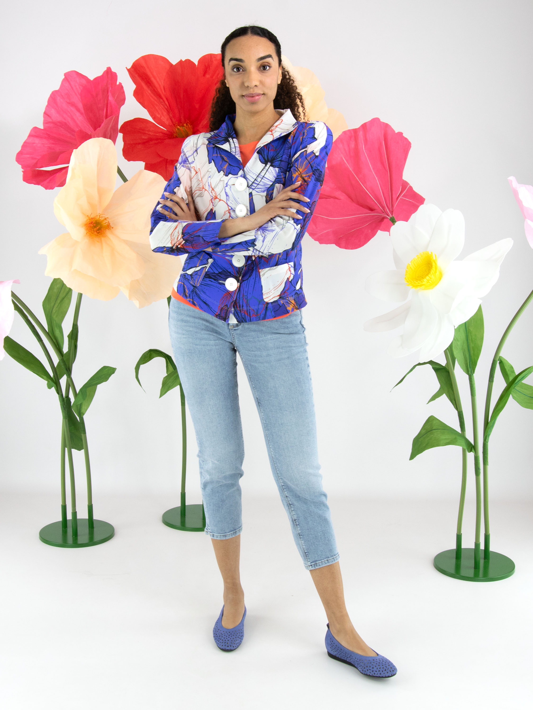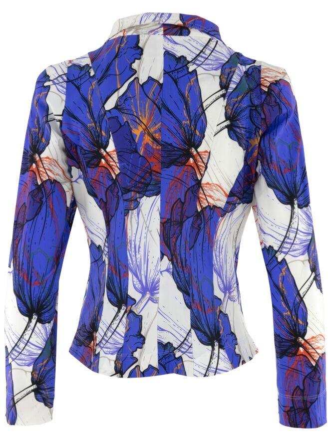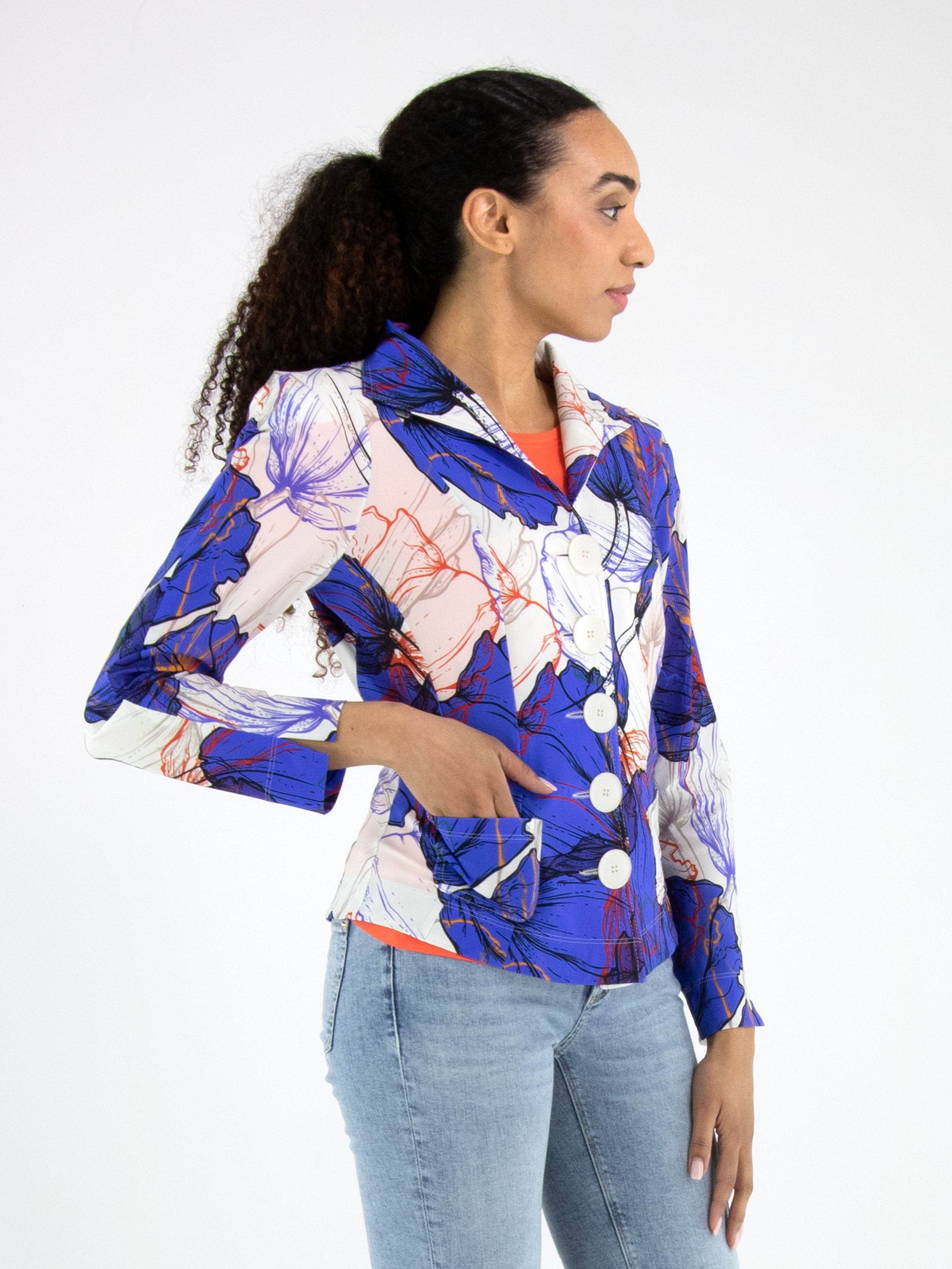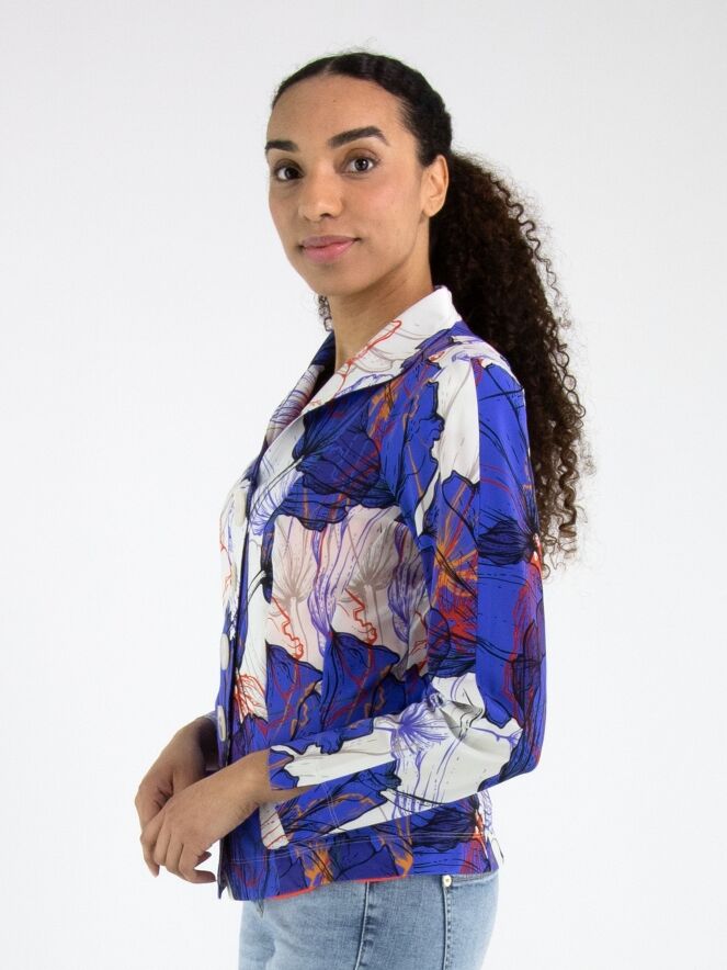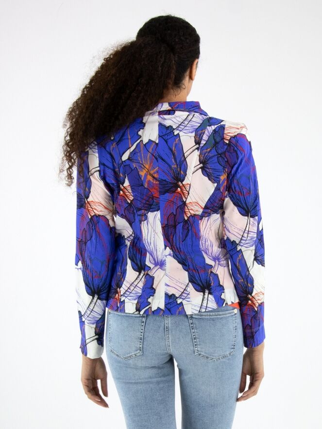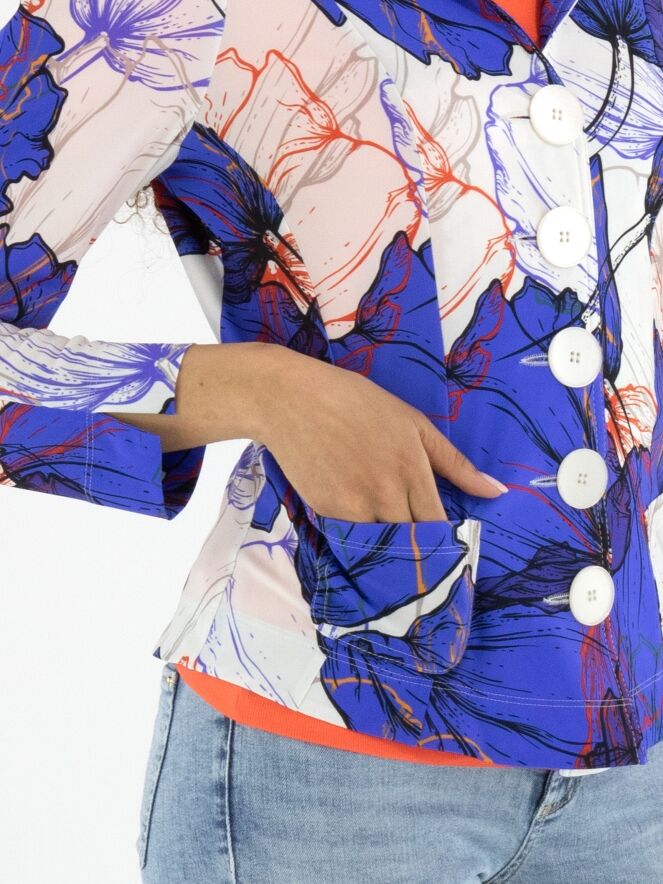 Blazer van Moq in een grafische bloemenprint in de kleuren rood, oranje en zwart op een blauw-witte achtergrond. De blazer sluit met vijf knopen en heeft een lichte, ongevoerde uitvoering, wat zorgt voor een comfortabele en moderne uitstraling. Deze blazer kan op 40 graden worden gewassen.