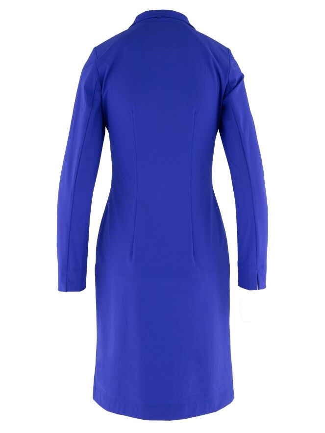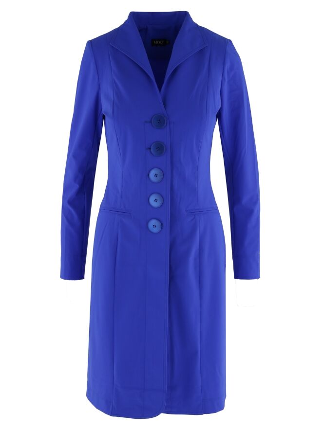 Een lange blazer van Moq in een kobaltblauwe kleur. De blazer heeft een sluiting met vijf grote knopen in dezelfde kleur als de blazer. Het model is ongevoerd en kan op 40 graden worden gewassen.
