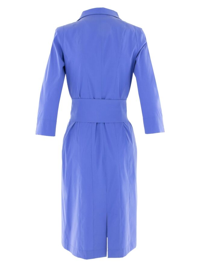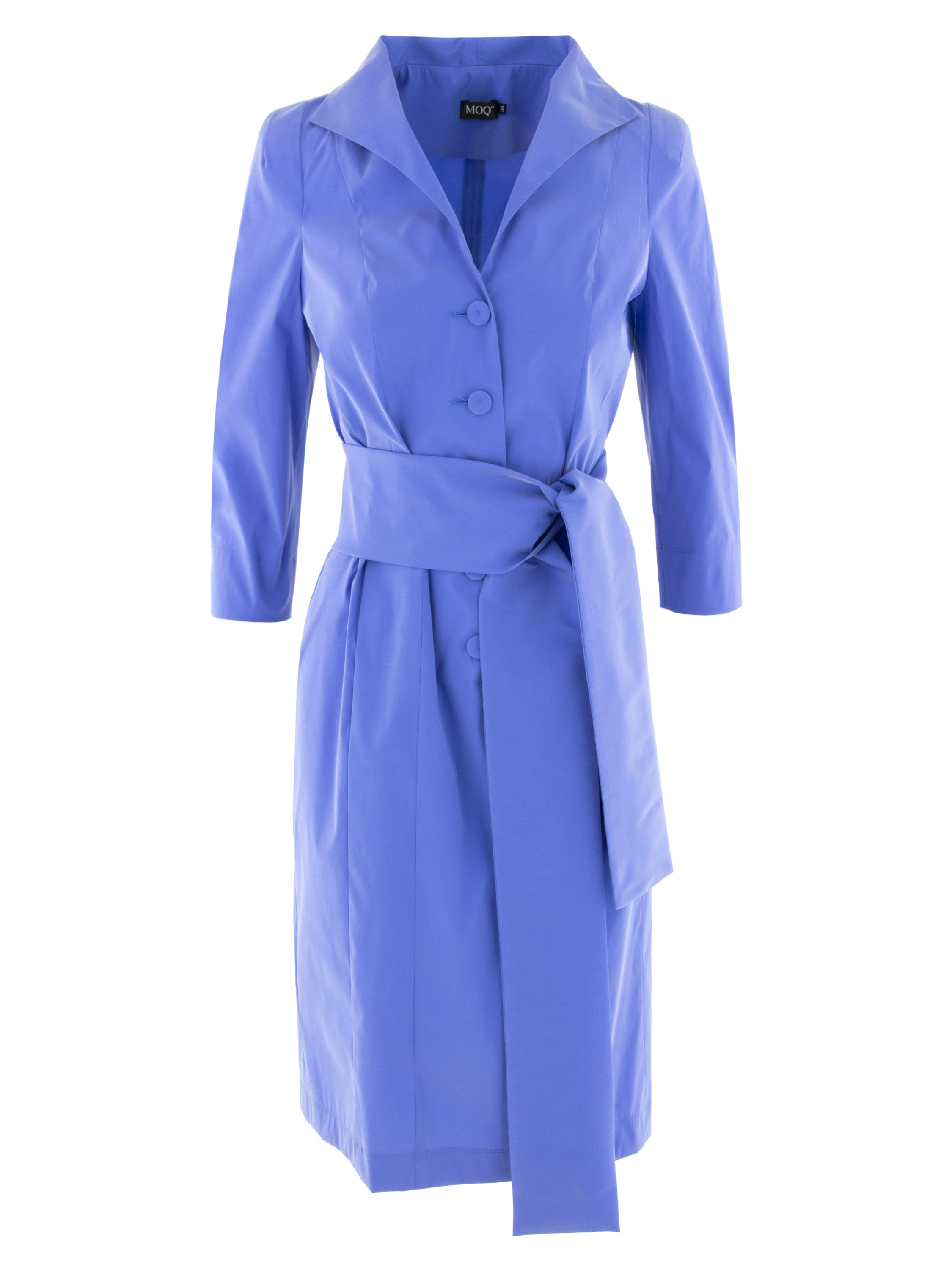 Doorknoopjurk van Moq in een zachte kobaltblauwe tint. De knoopsluiting loopt vanuit de V-hals tot onder de taille. De jurk heeft halflange mouwen en is ongevoerd, wat zorgt voor een lichte en comfortabele valling. In de taille is een brede ceintuur in dezelfde stof als de jurk verwerkt, waarmee het silhouet elegant kan worden geaccentueerd. Deze jurk kan op 30 graden worden gewassen.