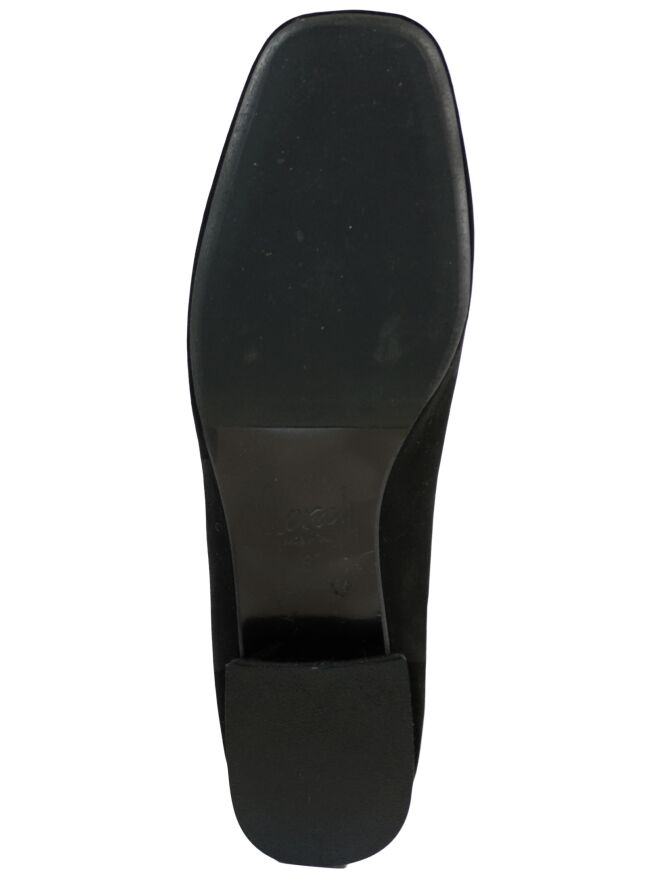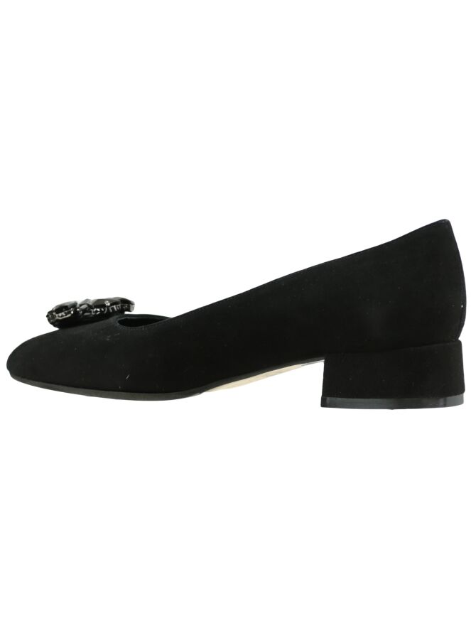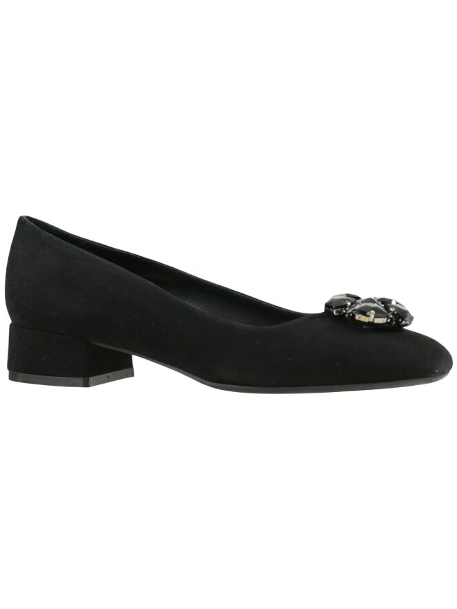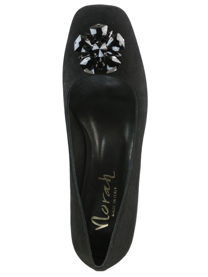 Een lage pump van het merk Norah in een zwarte kleur. De pump heeft een geronde vierkante neus met op de voorvoet een bloem vormige gesp met zwart kleurige stras steentjes. De pump heeft een elegante blokhak en de binnenkant van de pump is met leder gevoerd.