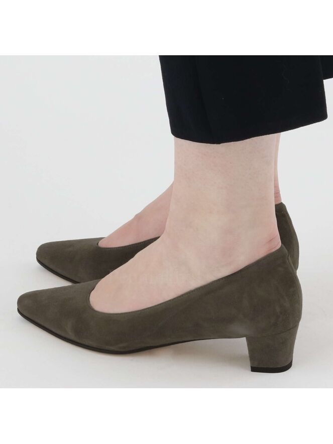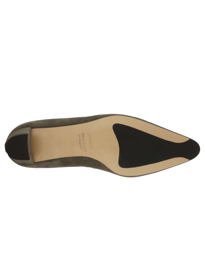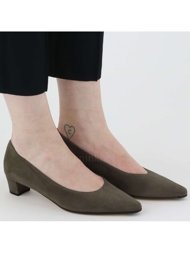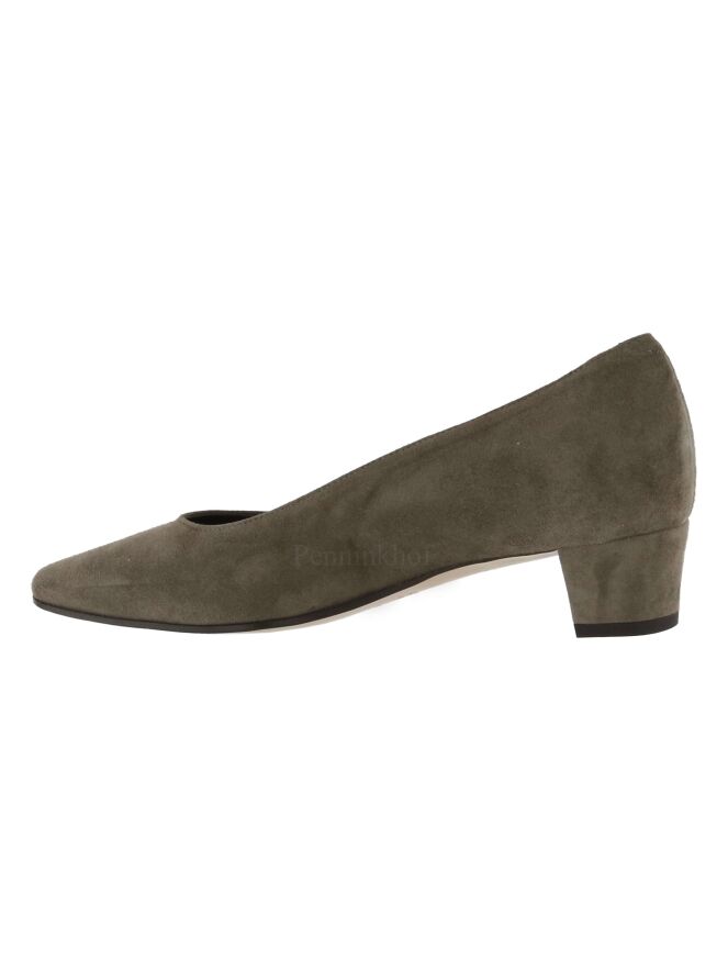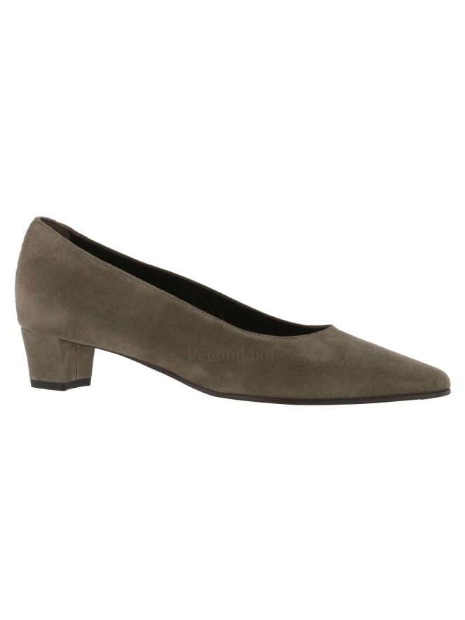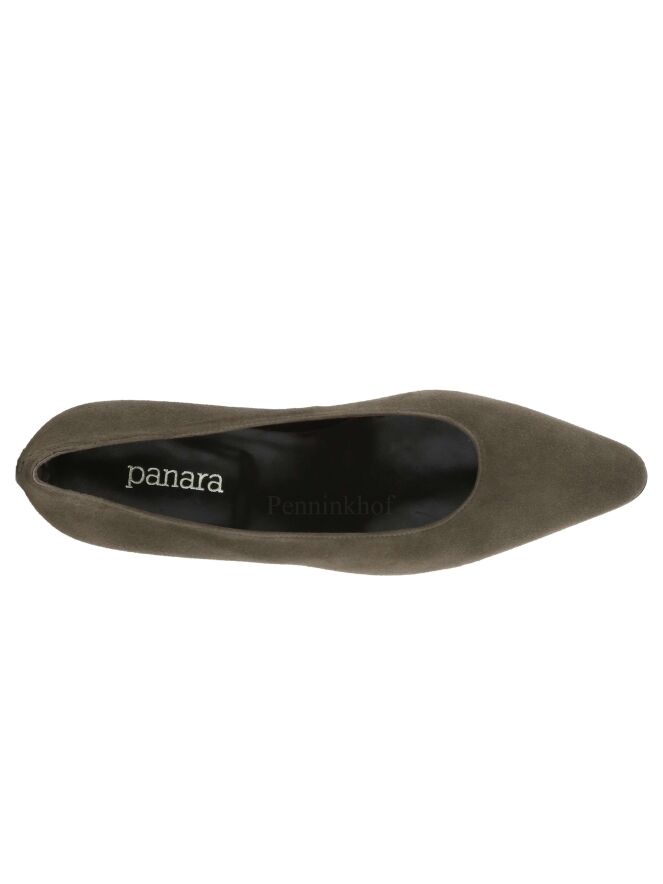 Een pump van het merk Panara in de kleur taupe. De pump heeft een spitse neus en de lage elegante hak is in hetzelfde suède bekleed als de pump. De binnenkant van de pump is met leder gevoerd.