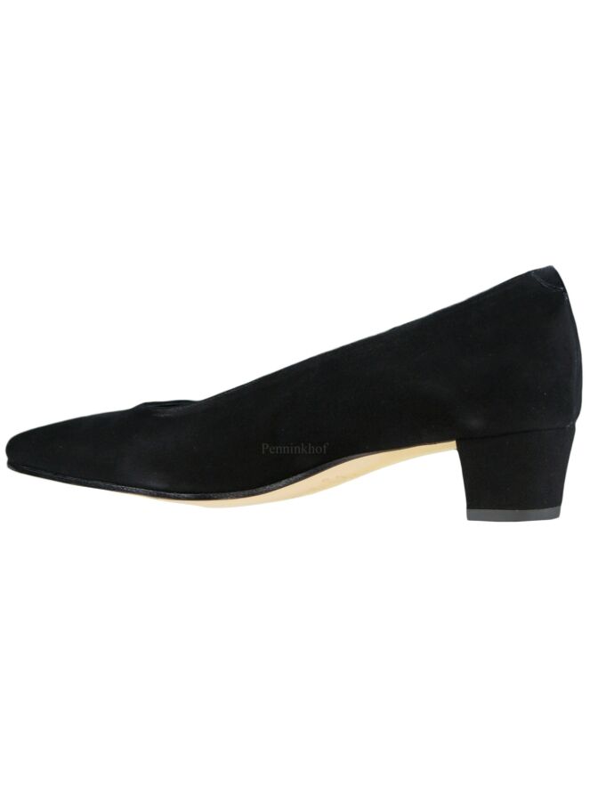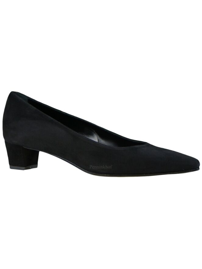 Een pump van het merk Panara in de kleur zwart. De pump heeft een spitse neus en de lage elegante hak is in hetzelfde suède bekleed als de pump. De binnenkant van de pump is met leder gevoerd.