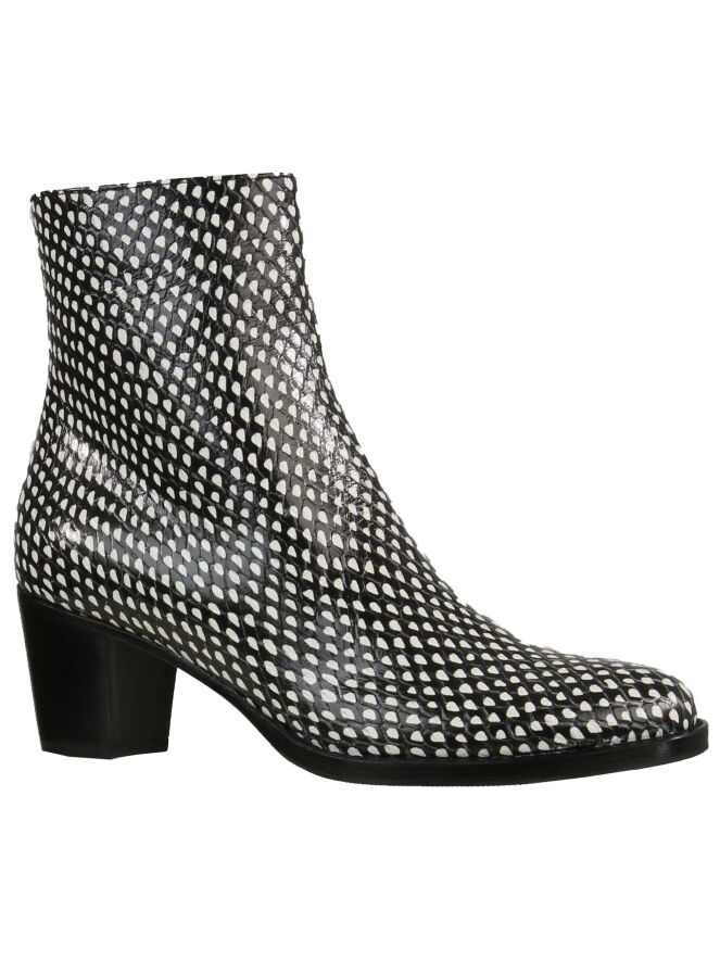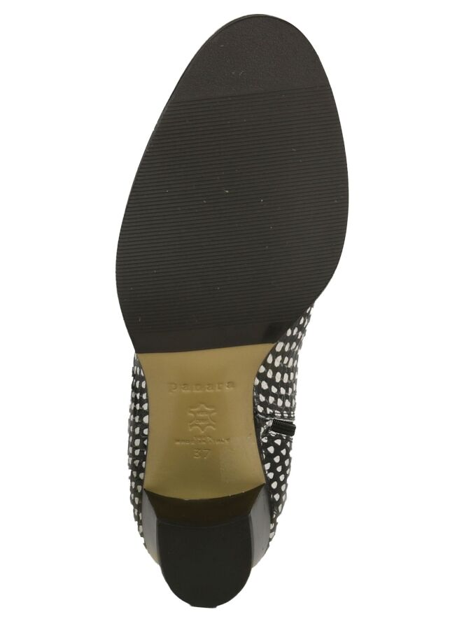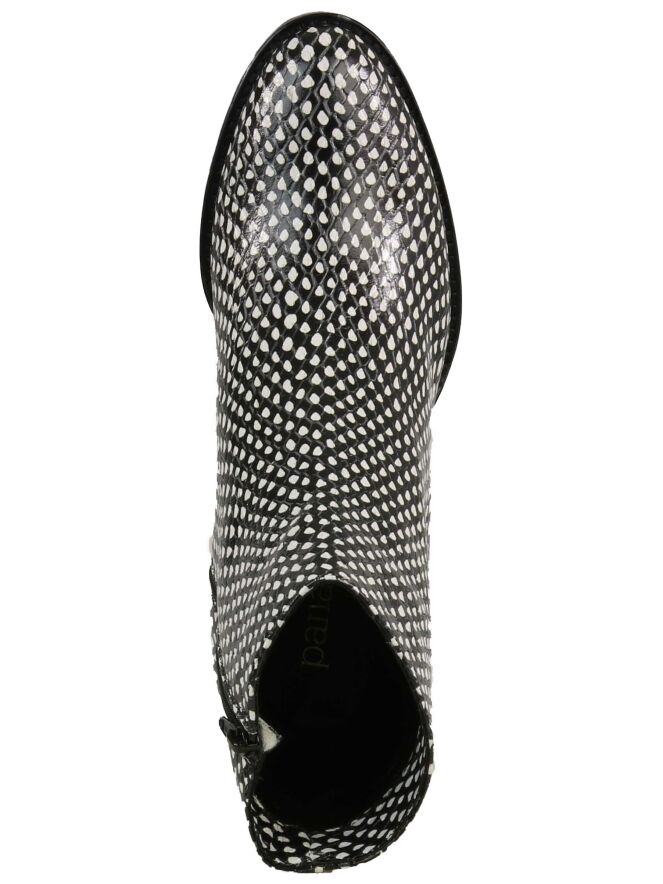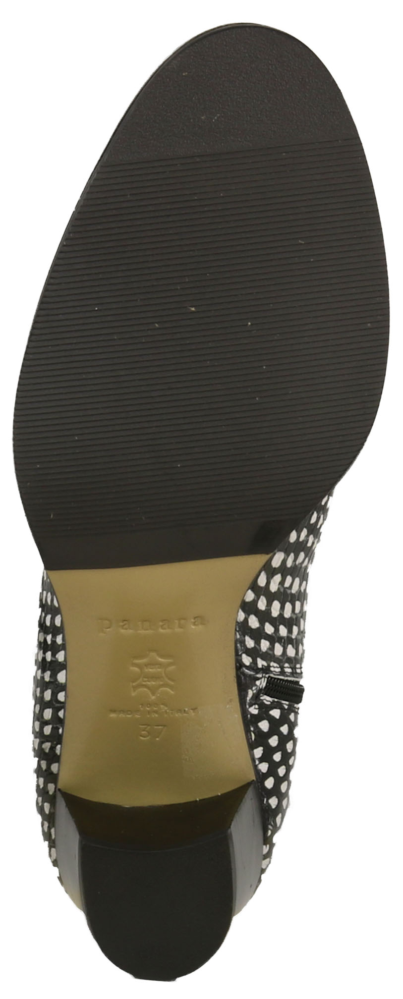 Een enkellaarsje van het merk Panara in een print met de kleuren zwart en wit. Het laarsje heeft een ronde neus en heeft een neutrale zwarte hak. De schachthoogte vanaf de hiel is 13 cm en de omtrek van de schacht is 25 cm. De binnenkant is met leder gevoerd.