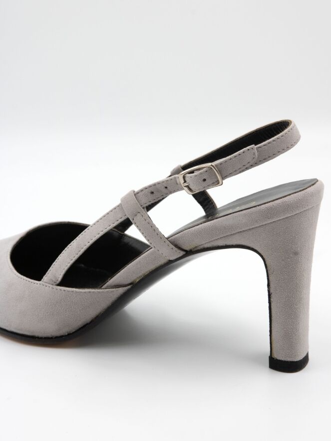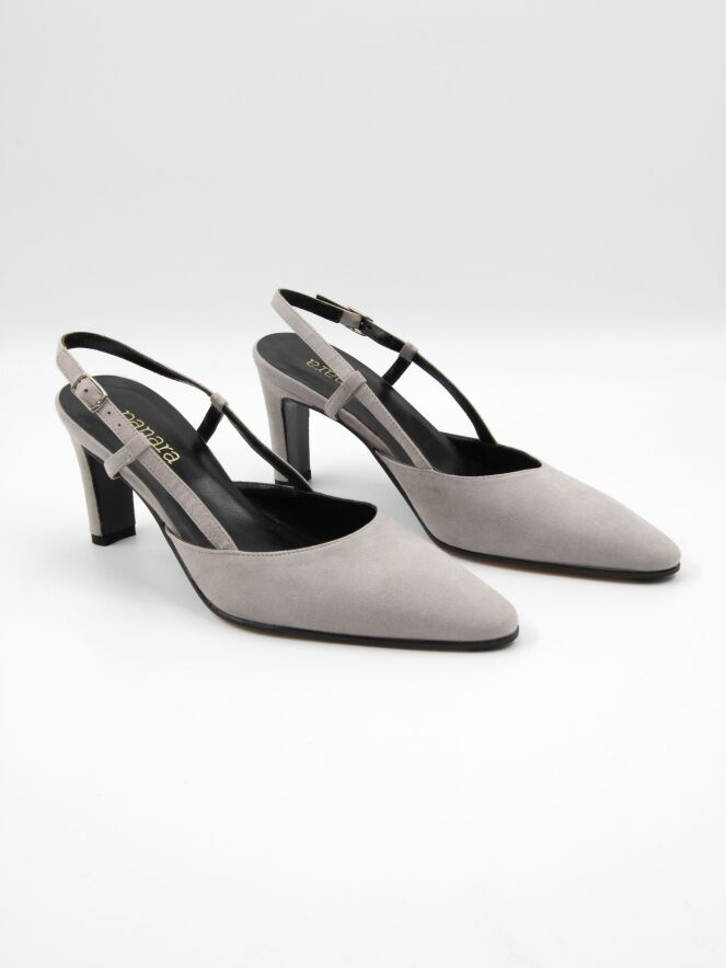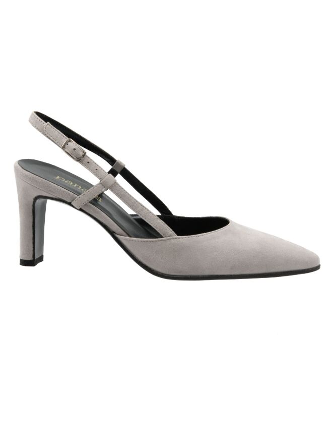 Een pump van het merk Panara met een open hiel in de kleur licht grijs. De pump heeft een spitse neus en de elegante hak is in hetzelfde materiaal bekleed als de pump. Het verstelbare hielbandje heeft een steun bevestiging aan beide zijden van de pump.