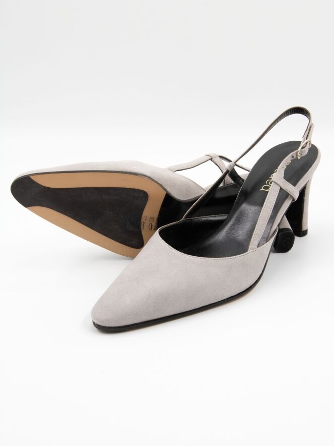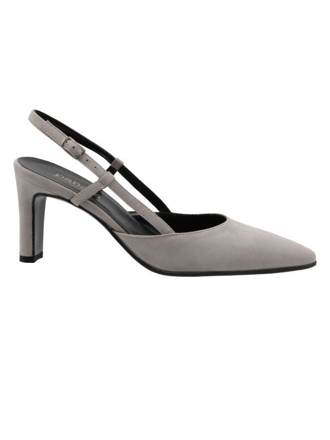 Een pump van het merk Panara met een open hiel in de kleur licht grijs. De pump heeft een spitse neus en de elegante hak is in hetzelfde materiaal bekleed als de pump. Het verstelbare hielbandje heeft een steun bevestiging aan beide zijden van de pump.