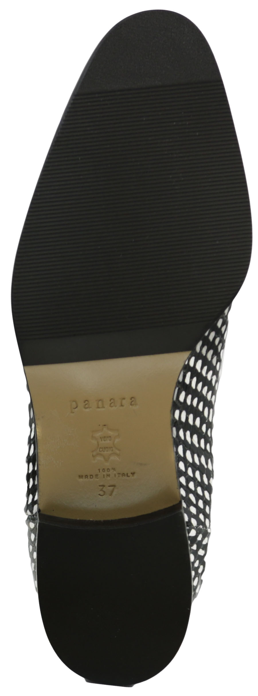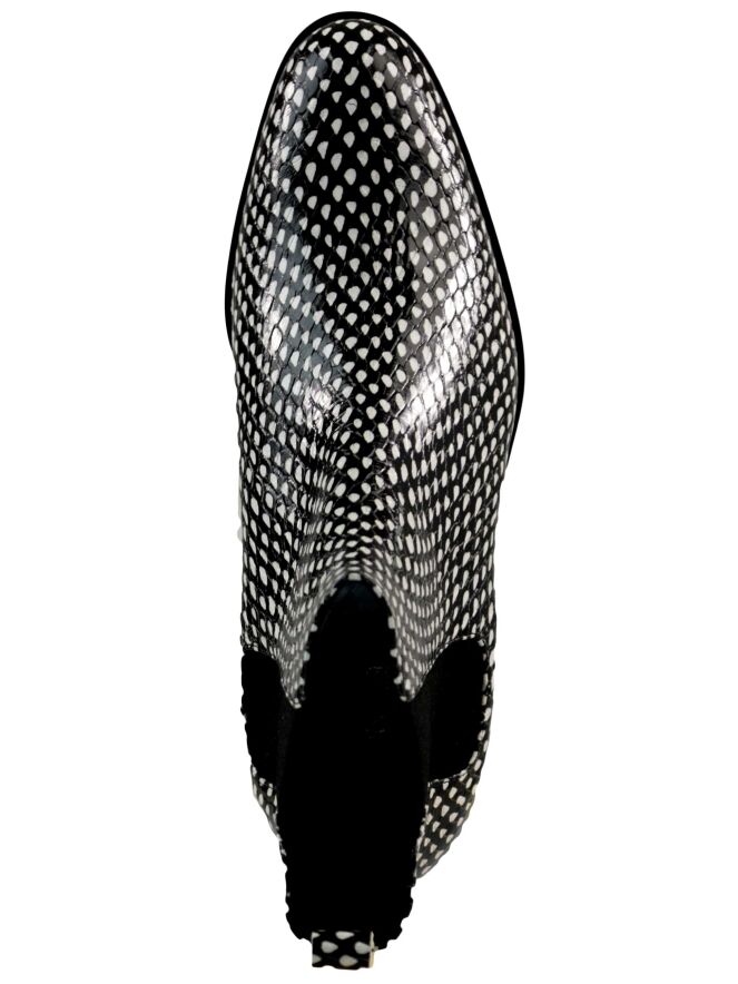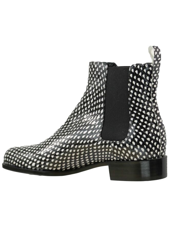 Een enkellaarsje van het merk Panara in een print met de kleuren zwart en wit. Aan beide zijden van het laarsje is een elastieken stof ingezet. De binnenkant van het enkellaarsje is met leder gevoerd.