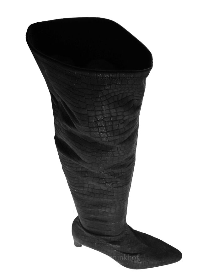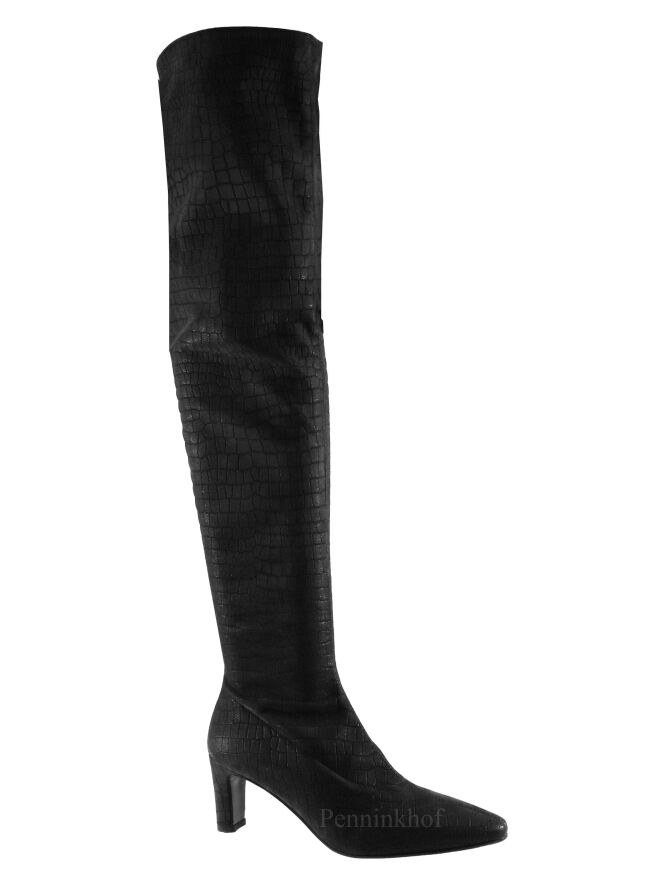 Een stretch knielaars van Panara in een giraffe print in meerdere tinten zwart. De laars heeft een iets spitse neus en de hak is bekleed in de stof van de laars.