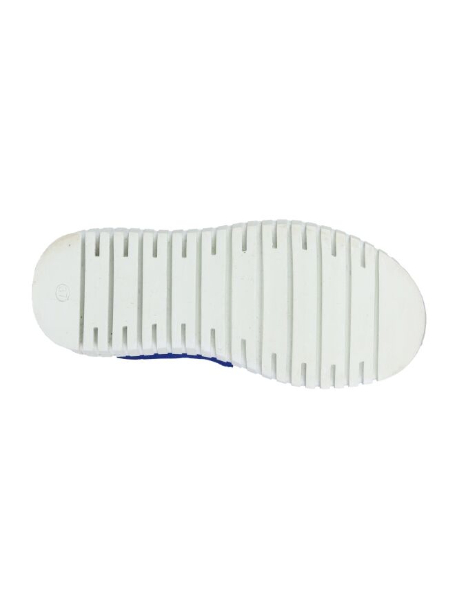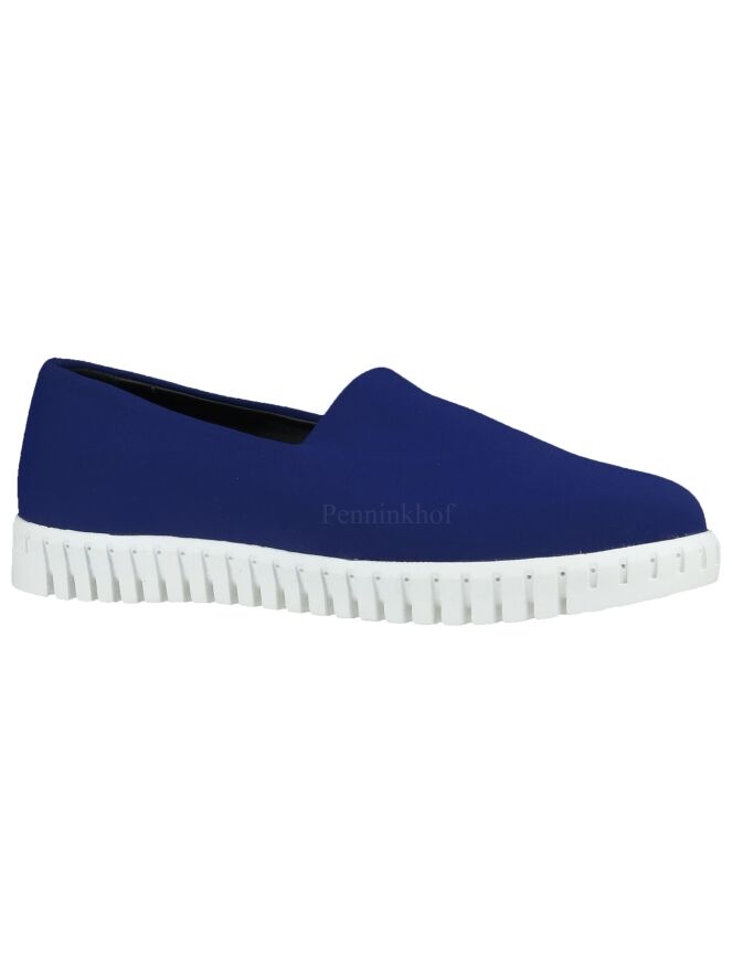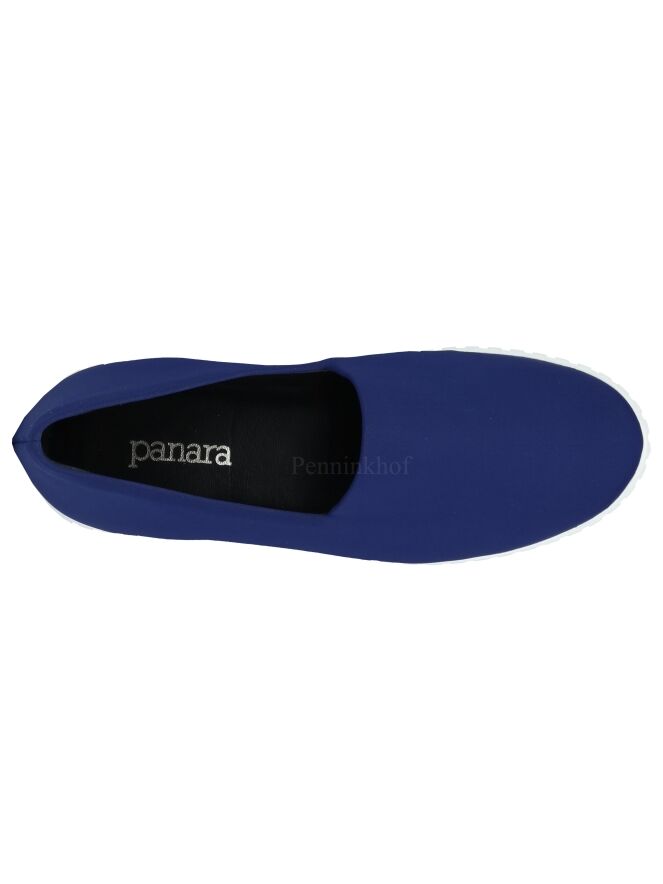 Een instapper van Panara in de kleur kobaltblauw. De stof is elastisch en sluit mooi aan op de voet. De witte zool is grof geribbeld.