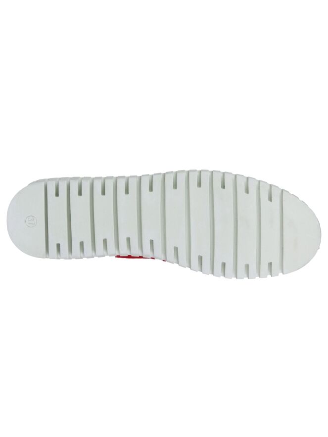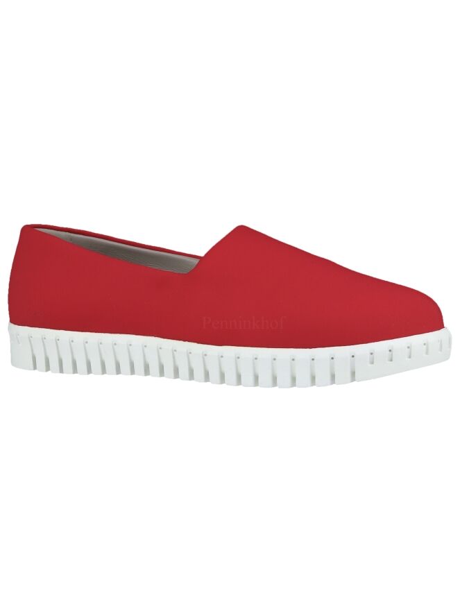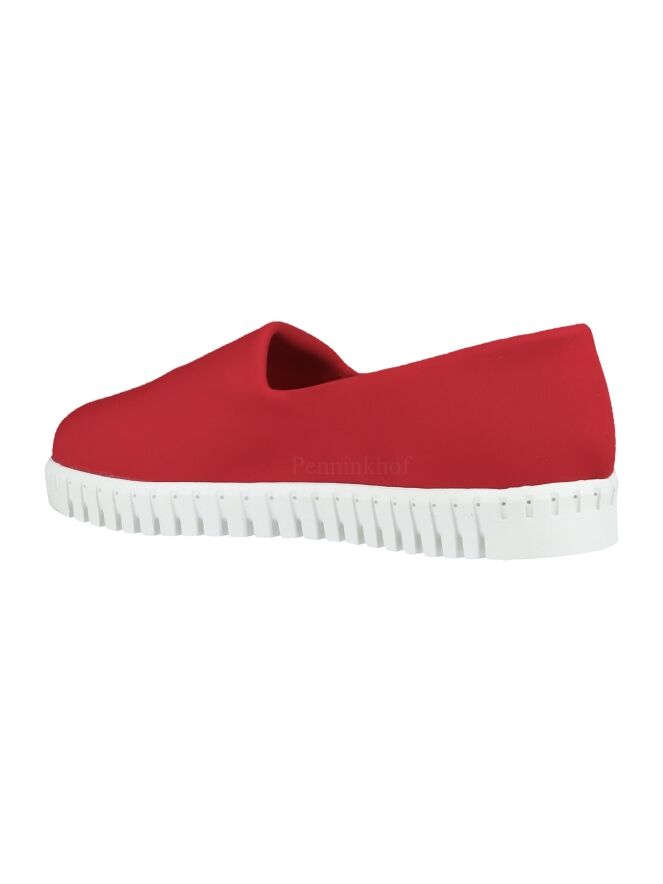 Een instapper van Panara in de kleur rood. De stof is elastisch en sluit mooi aan op de voet. De witte zool is grof geribbeld.