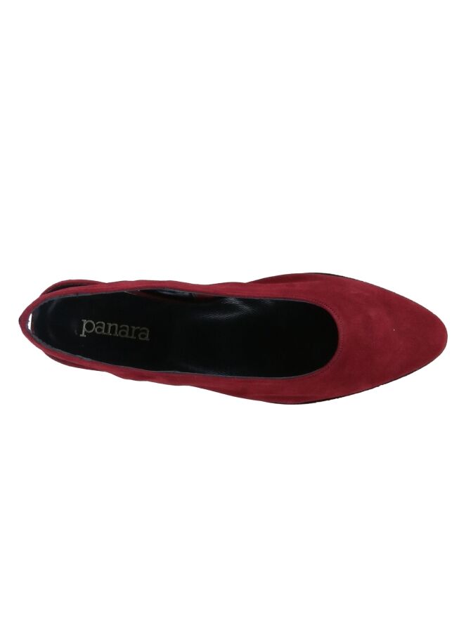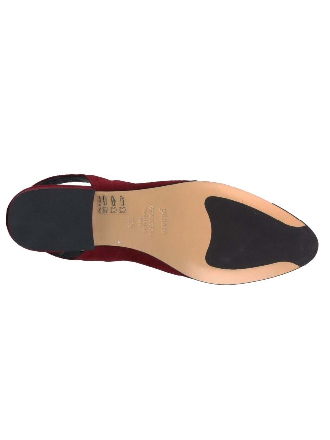 Een instapper met een open hiel van het merk Panara in de kleur beaujolais rood. De instapper heeft een ronde neus en de hal is bekleed met hetzelfde materiaal als de schoen. De binnenkant van de instapper is met leder gevoerd.