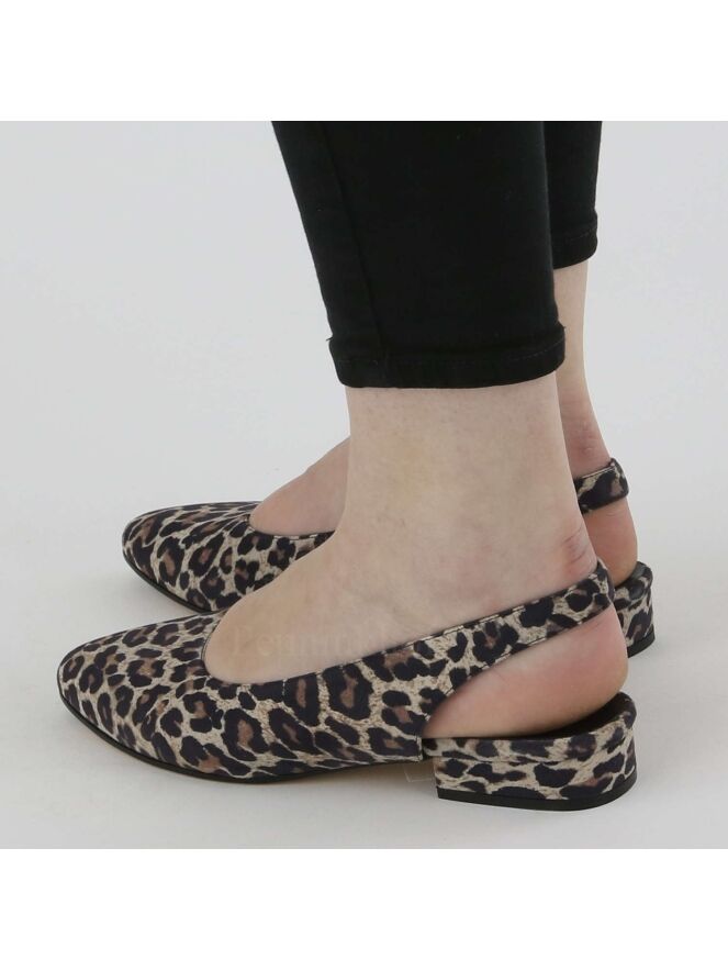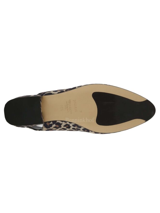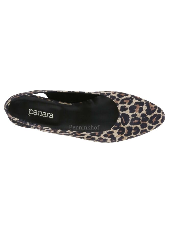 Een instapper met een open hiel van het merk Panara in een panterprint met meerdere tinten taupe, camel en zwart. De instapper heeft een ronde neus en de hiel is bekleed met hetzelfde materiaal als de schoen. De binnenkant van de instapper is met leder gevoerd.