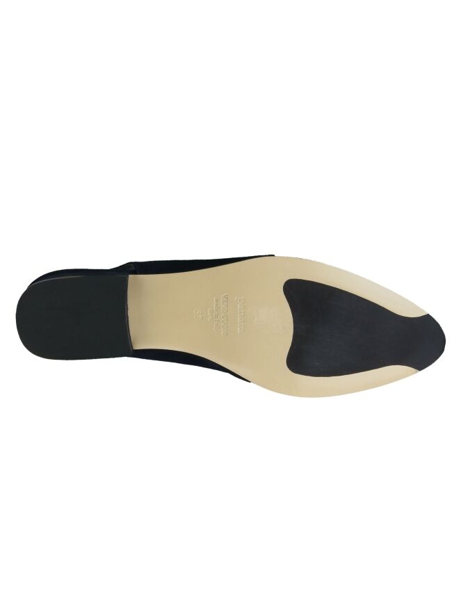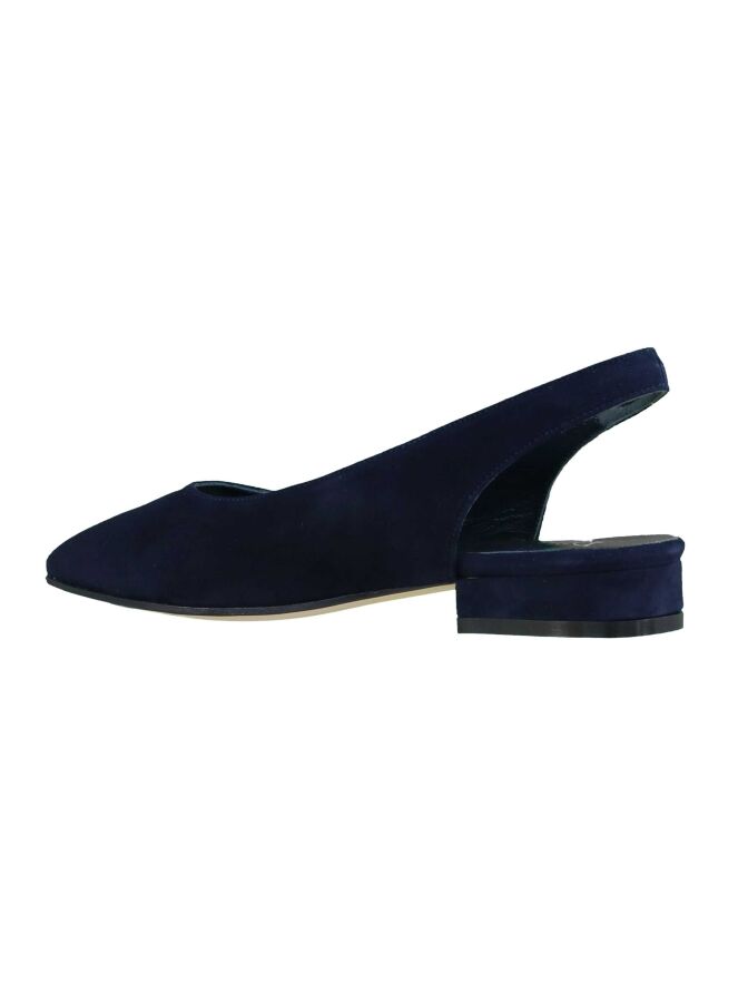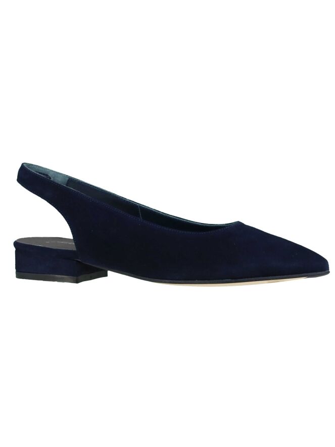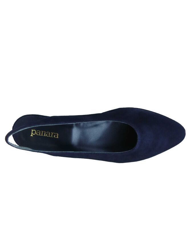 Een instapper met een open hiel van het merk Panara in de kleur marine blauw. De instapper heeft een ronde neus en de hak is bekleed met hetzelfde materiaal als de schoen. De binnenkant van de instapper is met leder gevoerd.