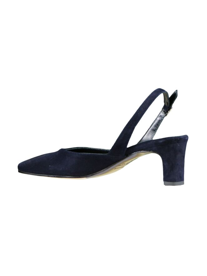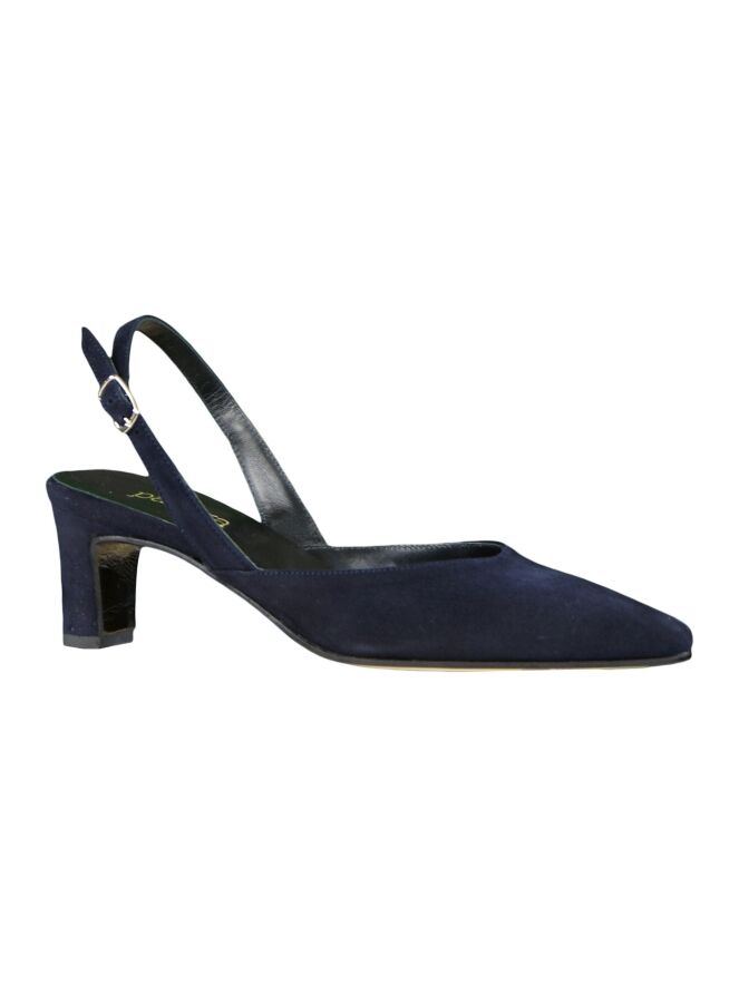 Een pump met een open hiel van het merk Panara in de kleur marine blauw. De pump heeft een spitse neus en de elegante hak is in hetzelfde materiaal bekleed als de pump. Het hielbandje is verstelbaar Een de binnenkant van de pump is met leder gevoerd.