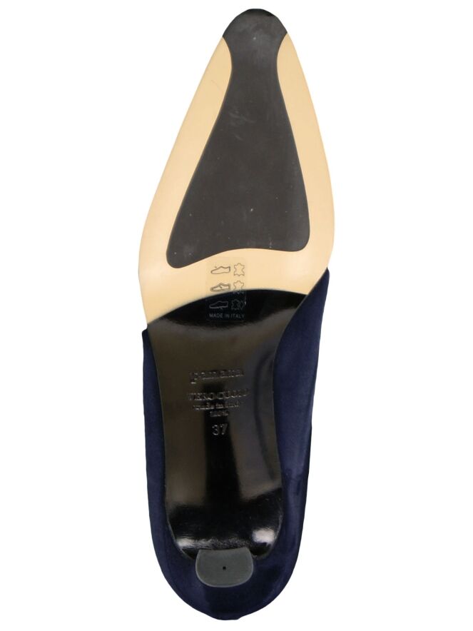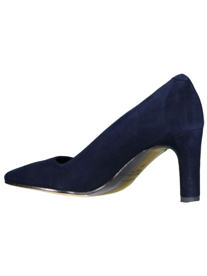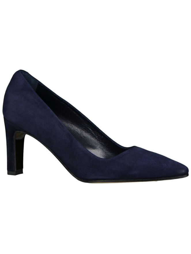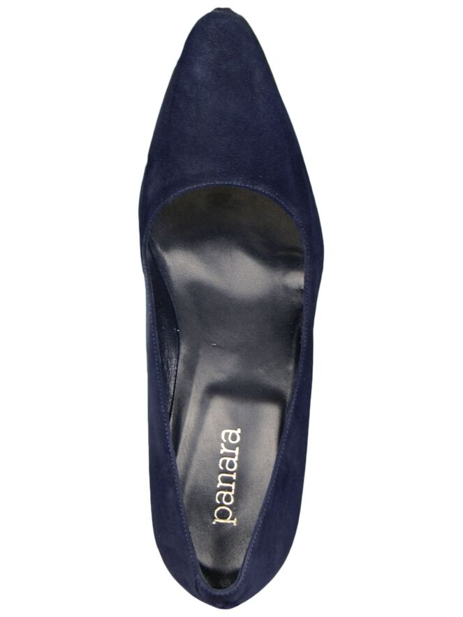 Een pump van het merk Panara in de kleur marine blauw. De pump heeft een spitse neus en de elegante slank gesneden hak is in hetzelfde materiaal als de pump van 7 cm hoog. De binnenkant van de pump is met leder gevoerd.