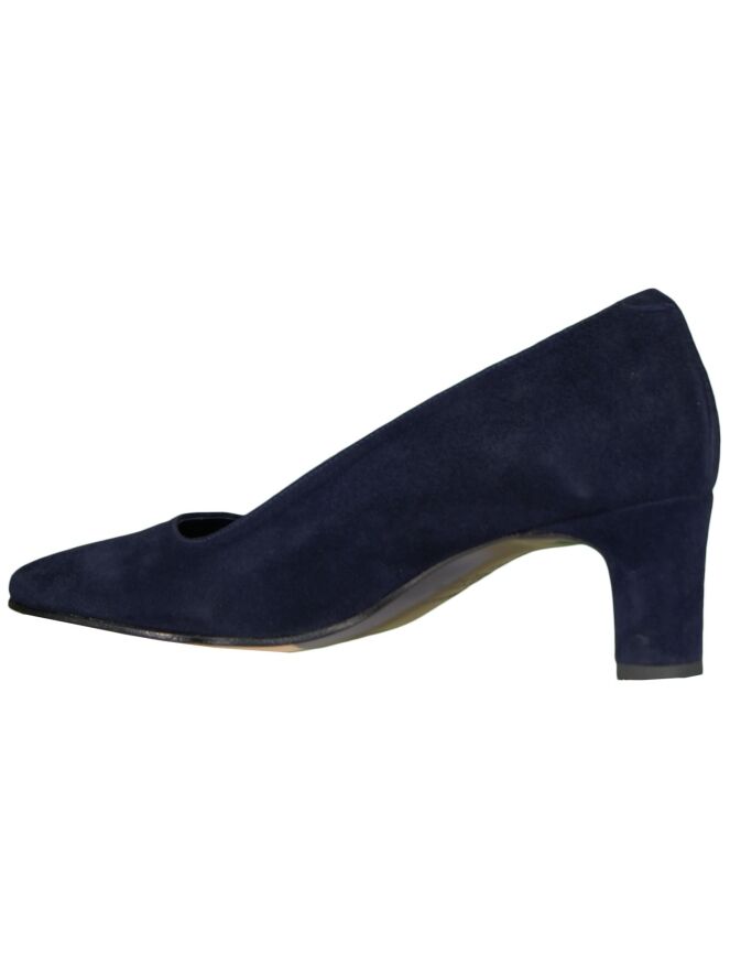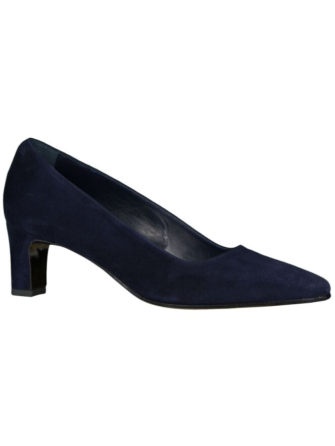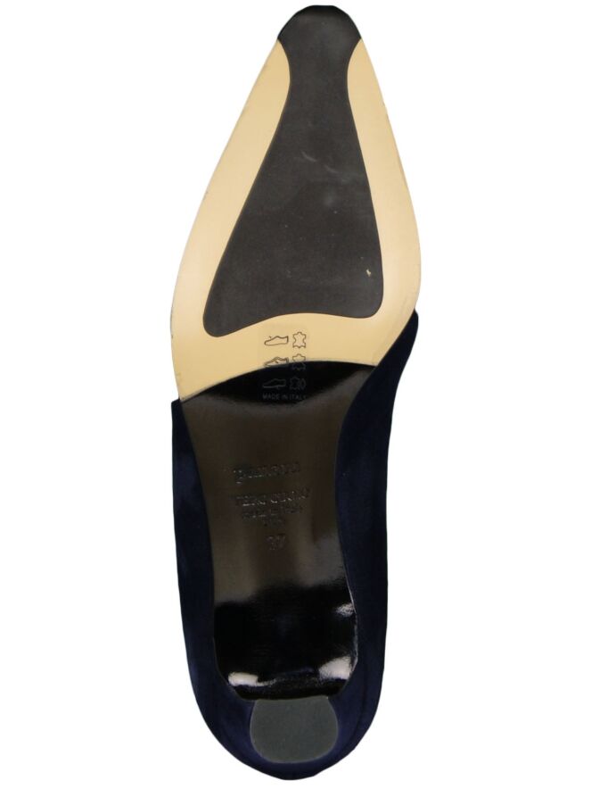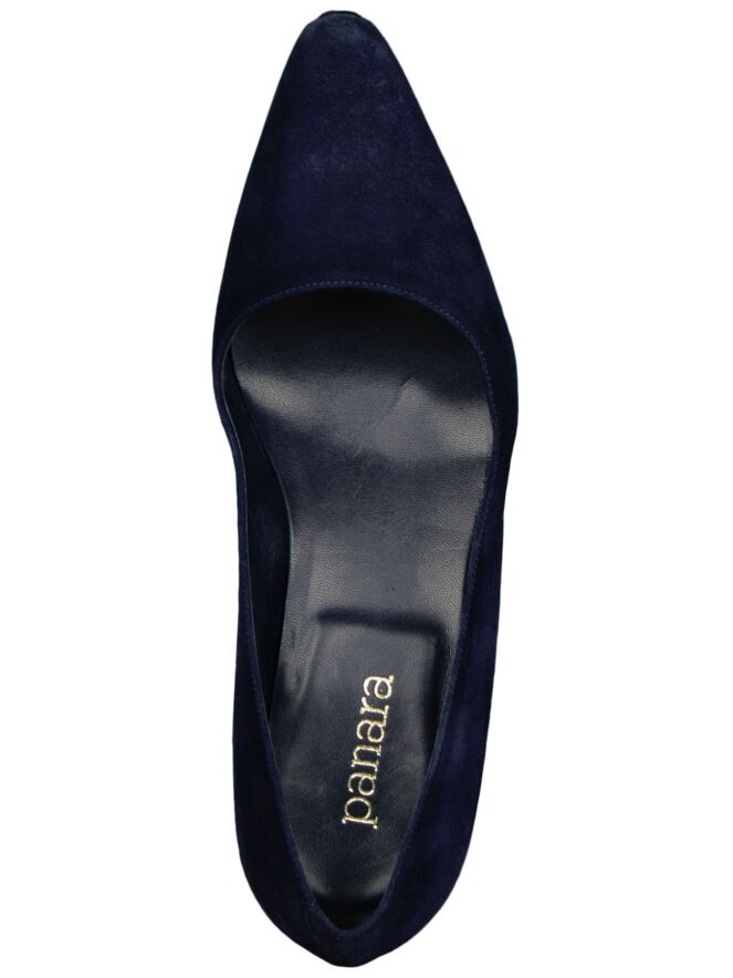 Een pump van het merk Panara in de kleur marine blauw. De pump heeft een spitse neus en de elegante slank gesneden hak is in hetzelfde materiaal als de pump. De binnenkant van de pump is met leder gevoerd.