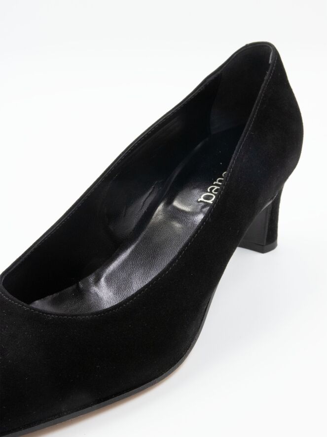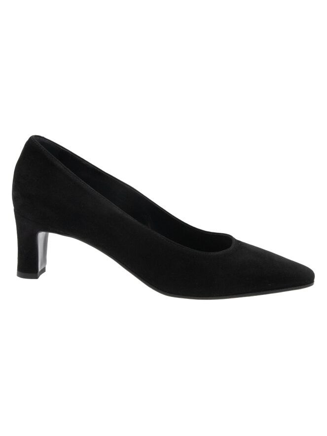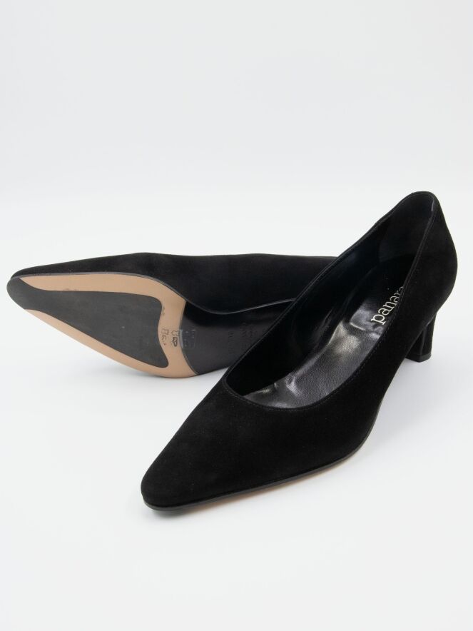 Een pump van het merk Panara in de kleur zwart. De pump heeft een spitse neus en de elegante slank gesneden hak is in hetzelfde materiaal als de pump. De binnenkant van de pump is met leder gevoerd.