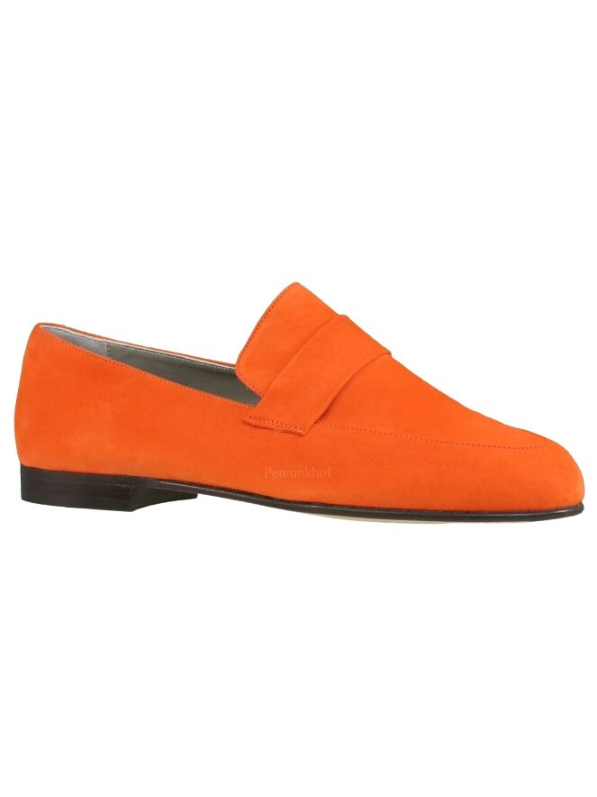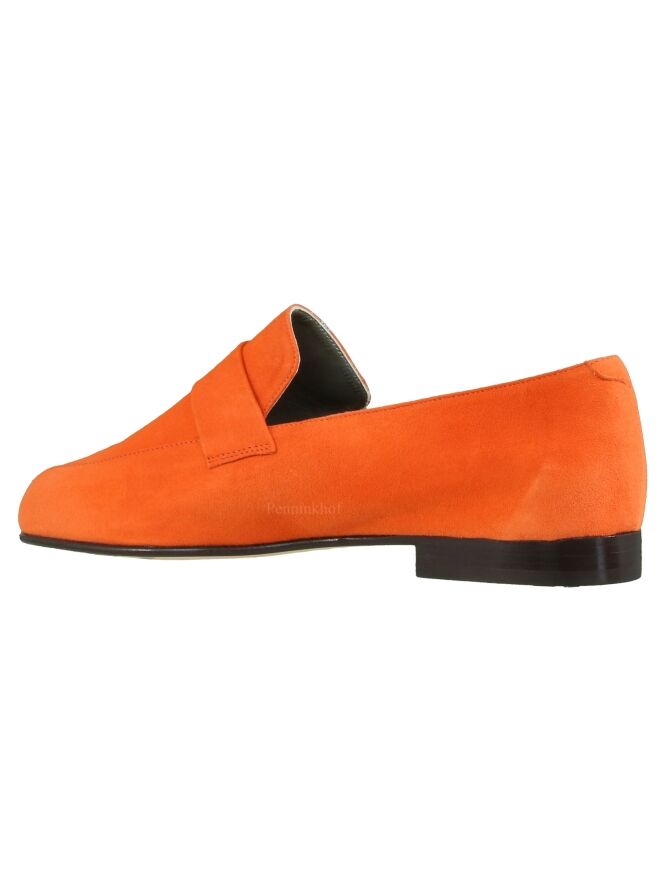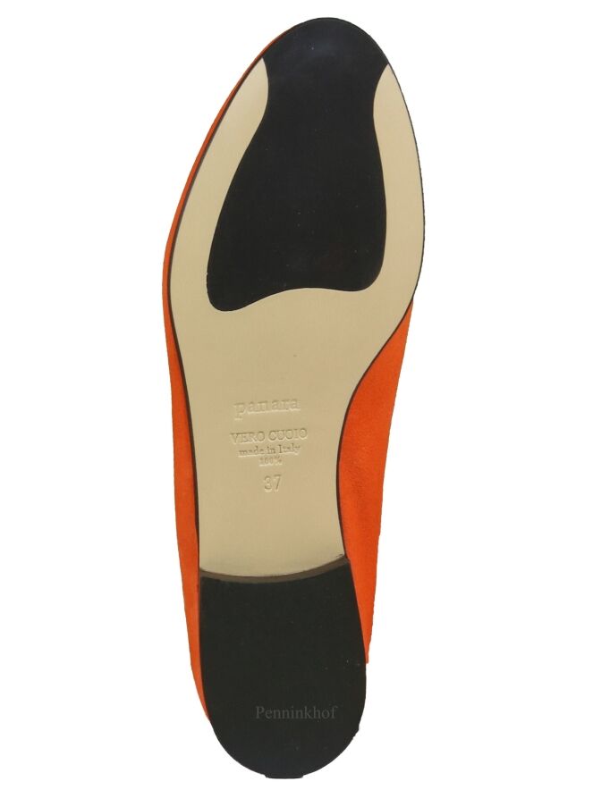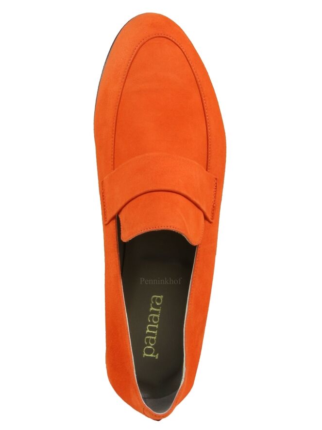 Een instapper van Panara in de kleur oranje. Over de voorvoet met een ronde neus is een smalle band in hetzelfde materiaal als de instapper. De instapper is aan de binnenkant met leder gevoerd.