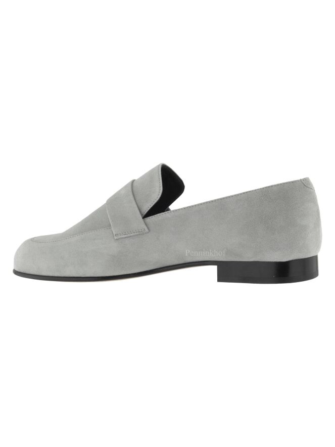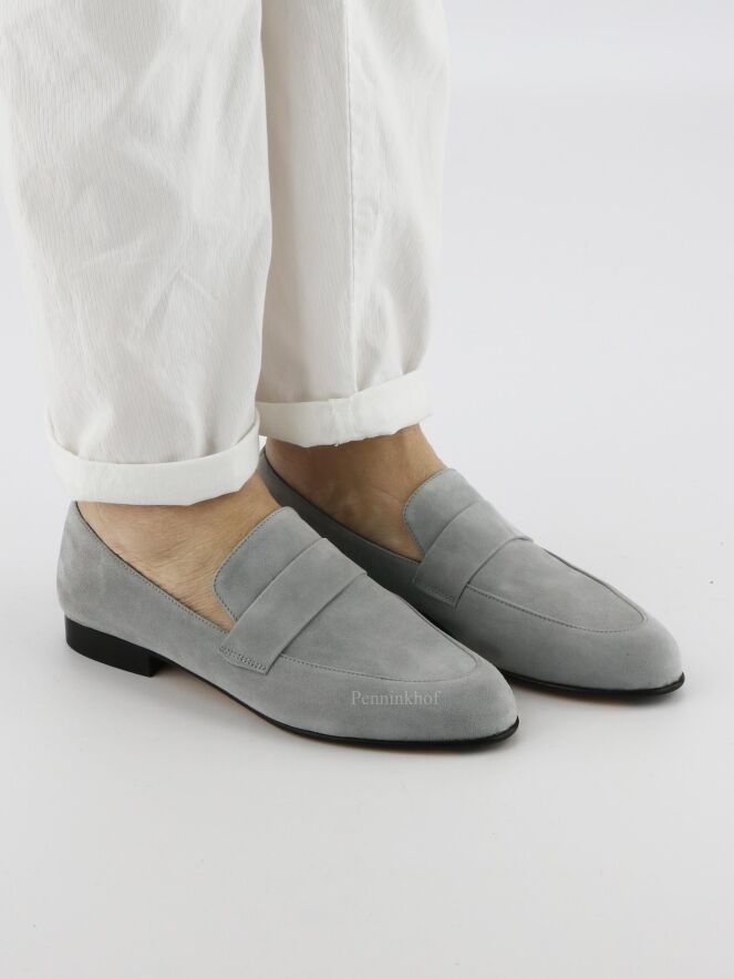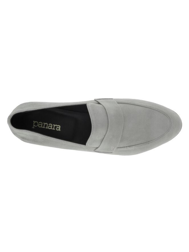 Een instapper van het merk Panara in de kleur grijs. Over de voorvoet met een ronde neus is een smalle band in hetzelfde materiaal als de instapper. De instapper is aan de binnenkant met leder gevoerd.