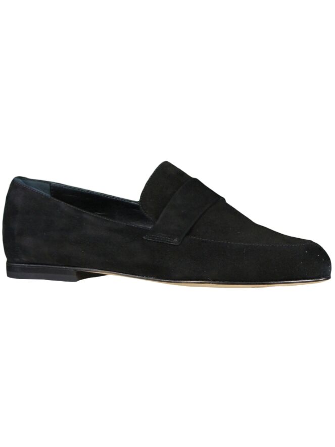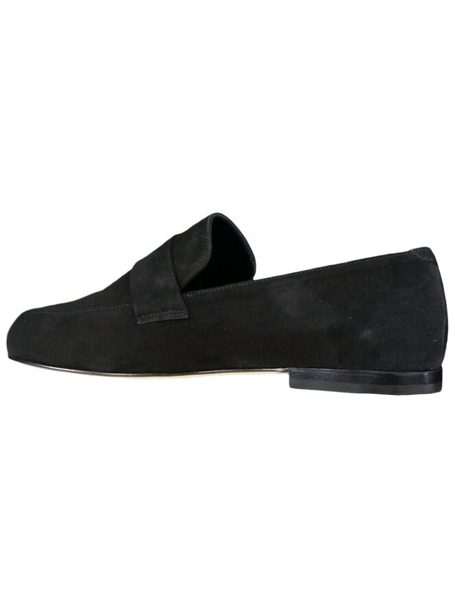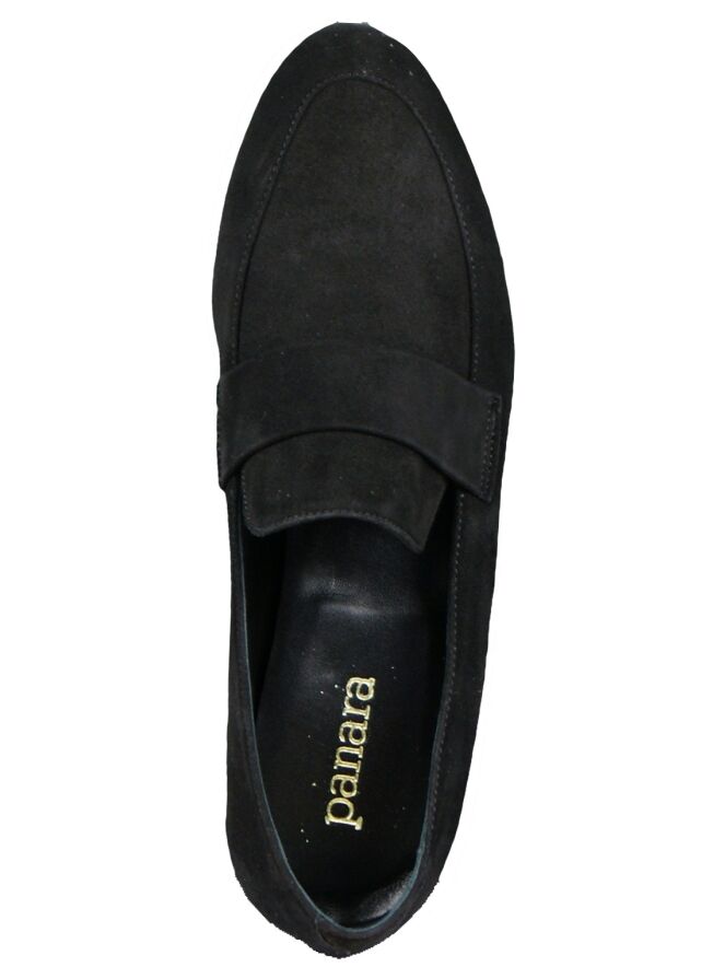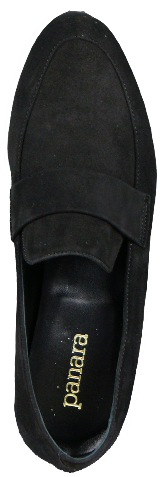 Een instapper van het merk Panara in de kleur zwart. Over de voorvoet met een ronde neus is een smalle band in hetzelfde materiaal als de instapper. De instapper is aan de binnenkant met leder gevoerd.