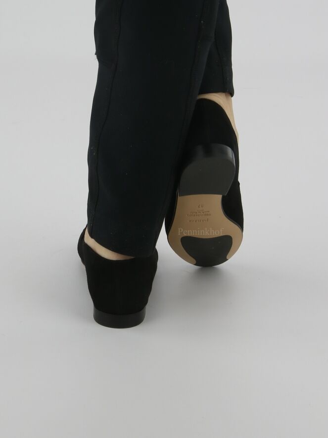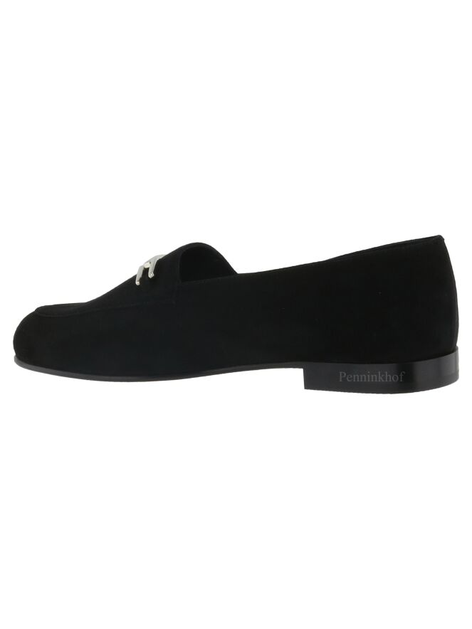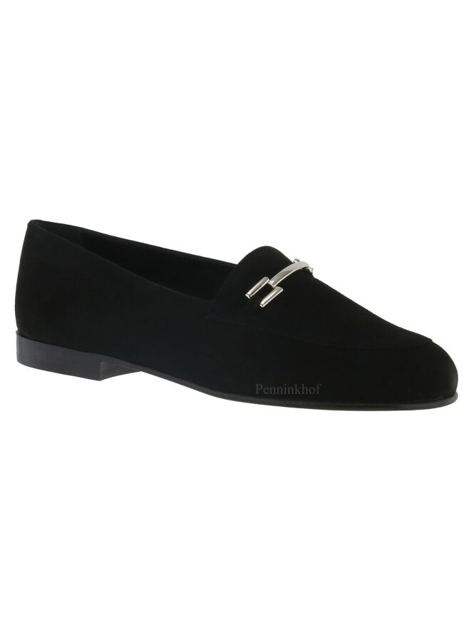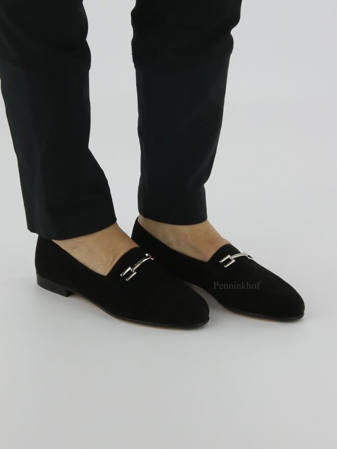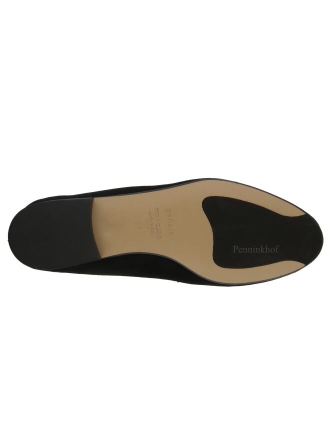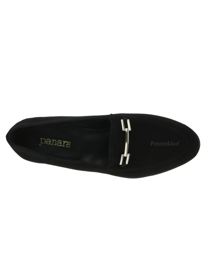 Een instapper van het merk Panara in een zacht camoscio suède in de kleur zwart. Over de voorvoet met een slank gesneden neus is een zilver kleurig bitje. De instapper is aan de binnenkant met leder gevoerd.