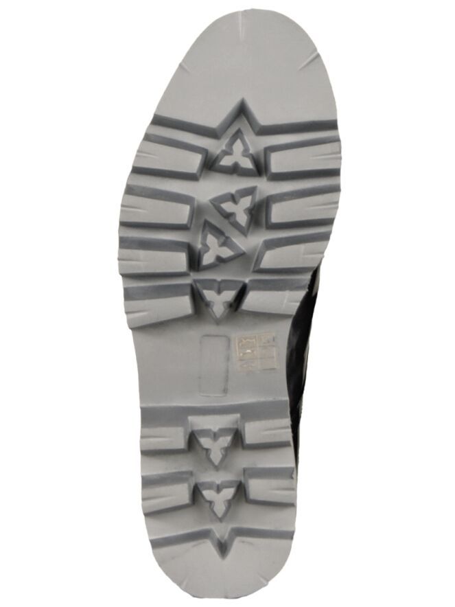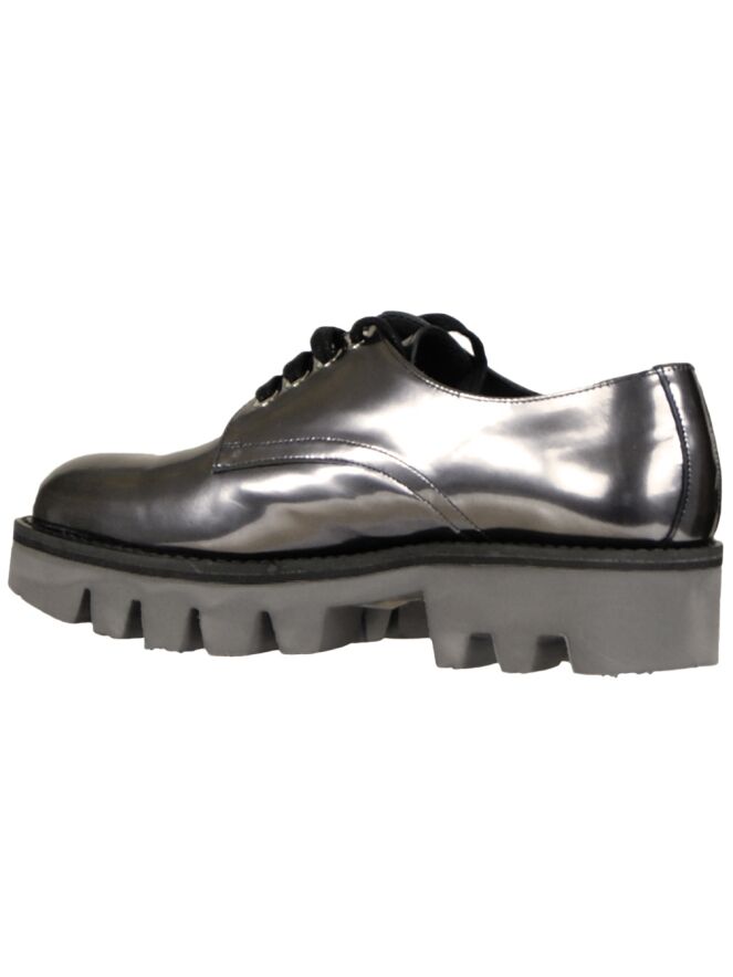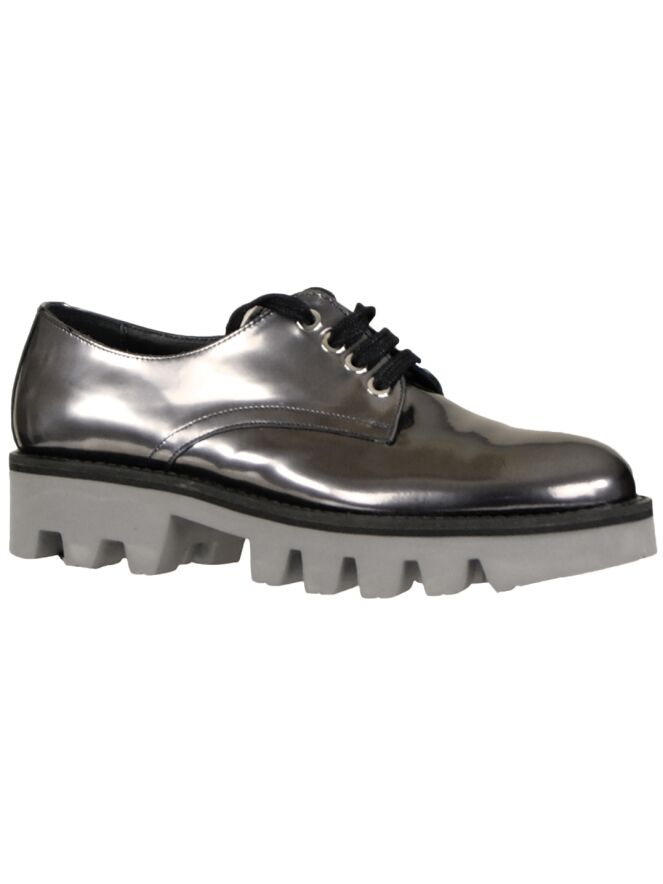 Een veter schoen van het merk Pertini in een zilver metallic kleur. De schoen is uitgevoerd in lakleder met een sportieve grove zool. De zool is gekarteld en heeft lichte kleur. De schoen is aan de binnen zijde met leder gevoerd.