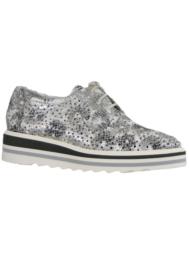 Een veterschoen van het merk Pertini in een reptiel print met meerdere kleuren grijs en wit. Het leder van de schoen is geperforeerd. De zool is opgebouwd in 3 kleuren. Deze veterschoen is aan de binnenzijde met leder gevoerd.