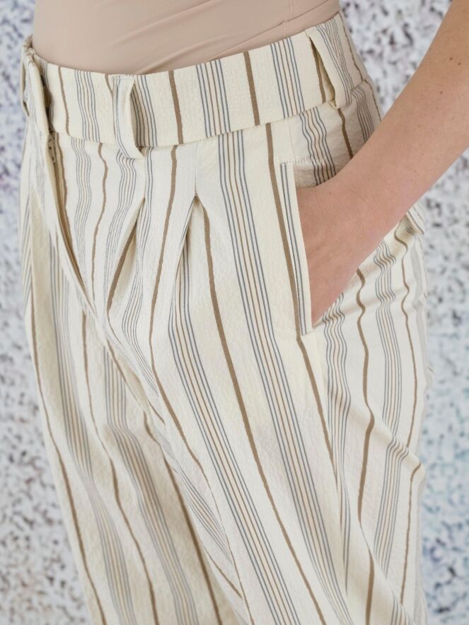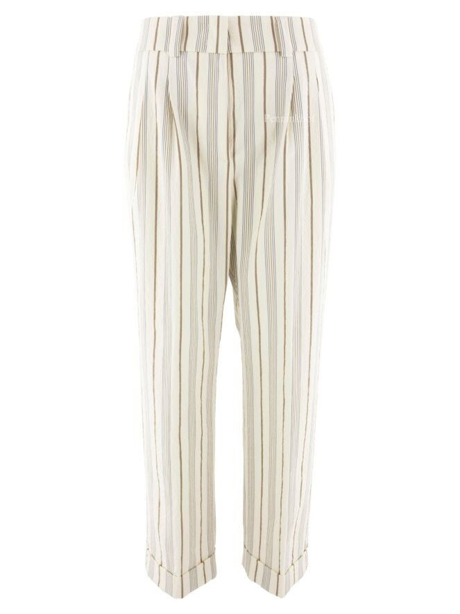 Een broek van Peserico in een strepen patroon met de kleuren beige, grijs en bruin. Vanuit de taille zijn er enkele bandplooien. Aan de onderkant van de pijpen is een omslag. Deze broek mag niet worden gewassen.