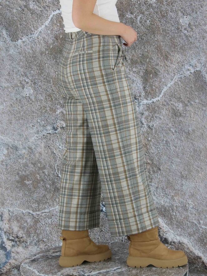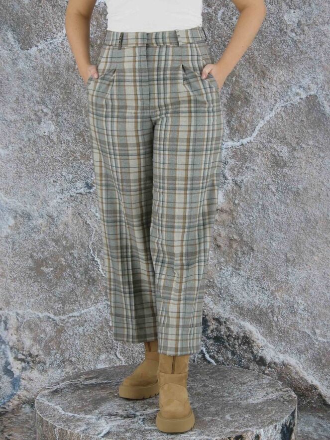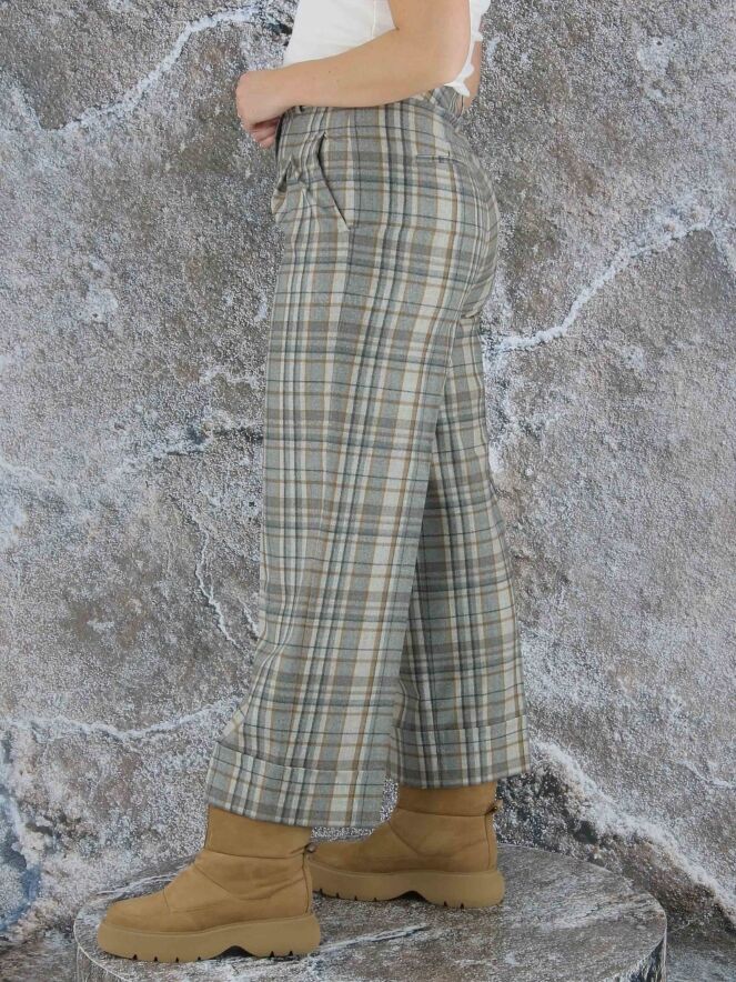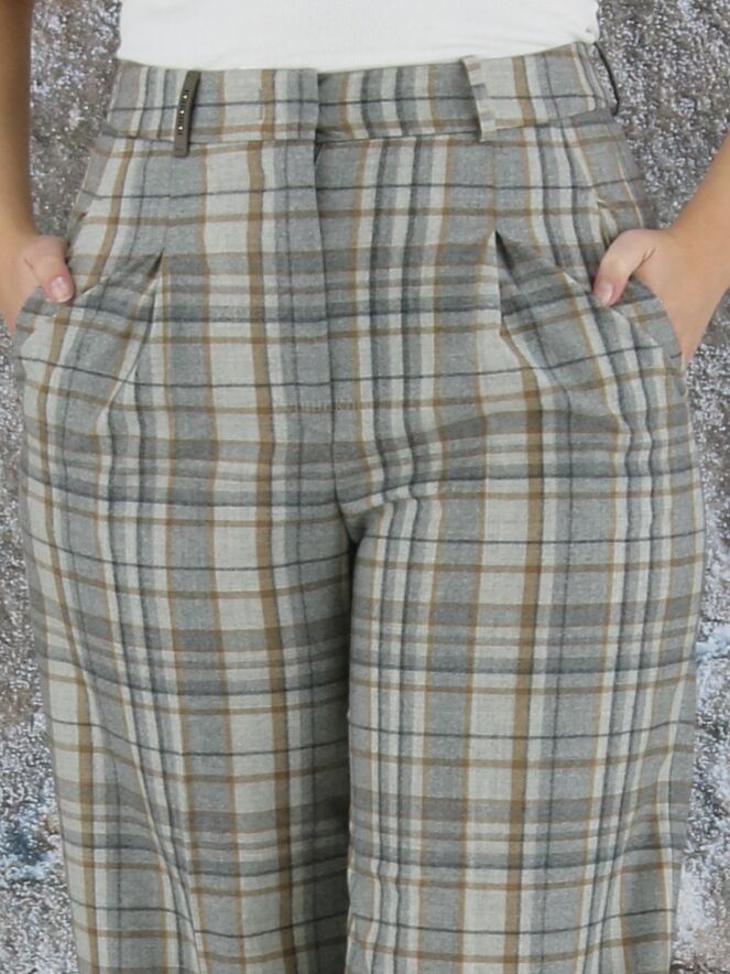 Een wijde broek van Peserico in een ruitpatroon met meerdere tinten grijs en camel. Vanuit de taille zijn er enkele bandplooien. De broek heeft steekzakken en aan de onderkant van de pijpen is een brede omslag. Deze broek mag op de hand worden gewassen.