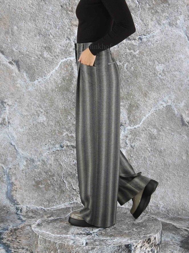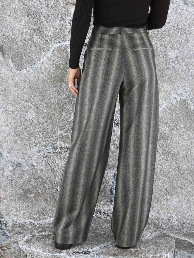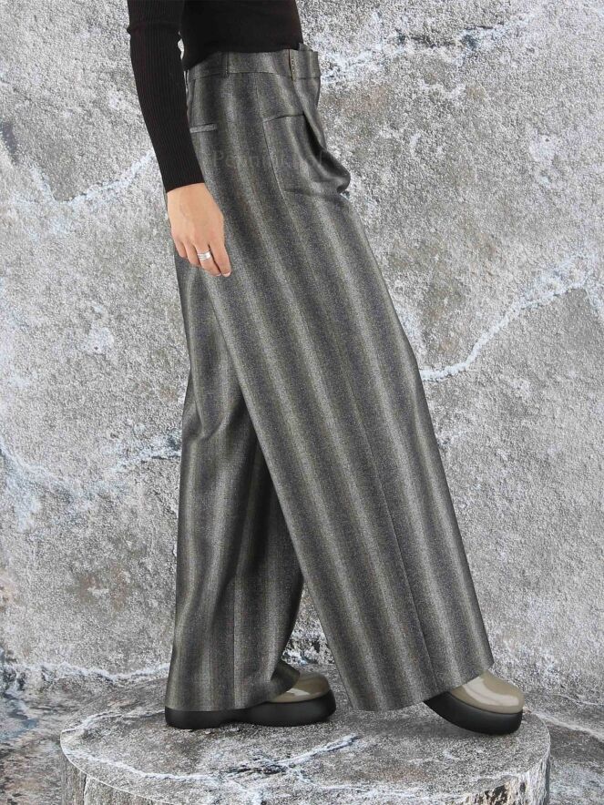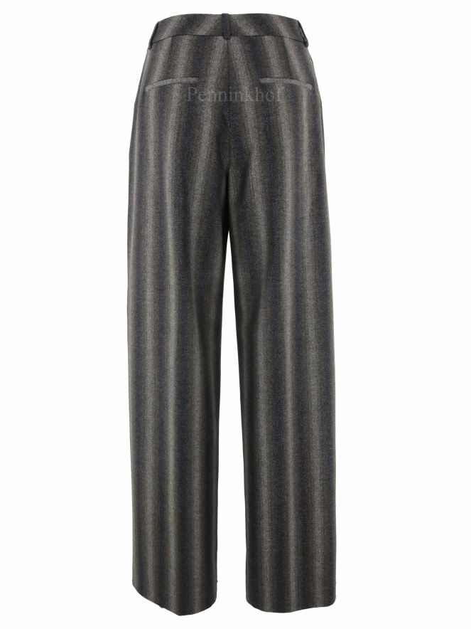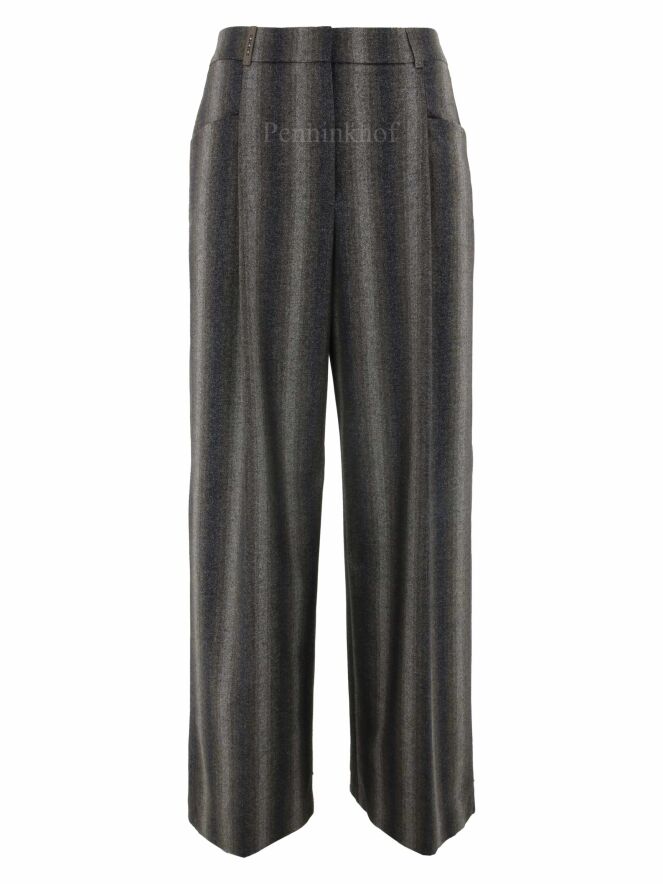 Een wijd vallende broek van Peserico in een gemêleerde strepen structuur met de kleuren donkergrijs, beige, taupe en donkerbruin. Door de stof is een fijn zilverdraad geweven. De broek heeft 2 bandplooien die maken dat de stof van de pijpen een golvende "look" hebben. Deze broek mag niet worden gewassen.