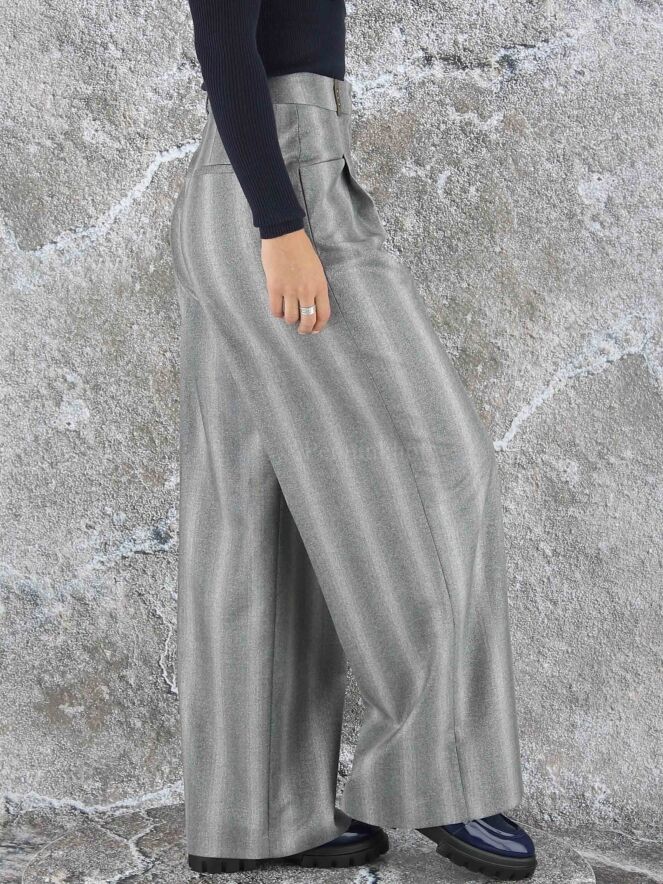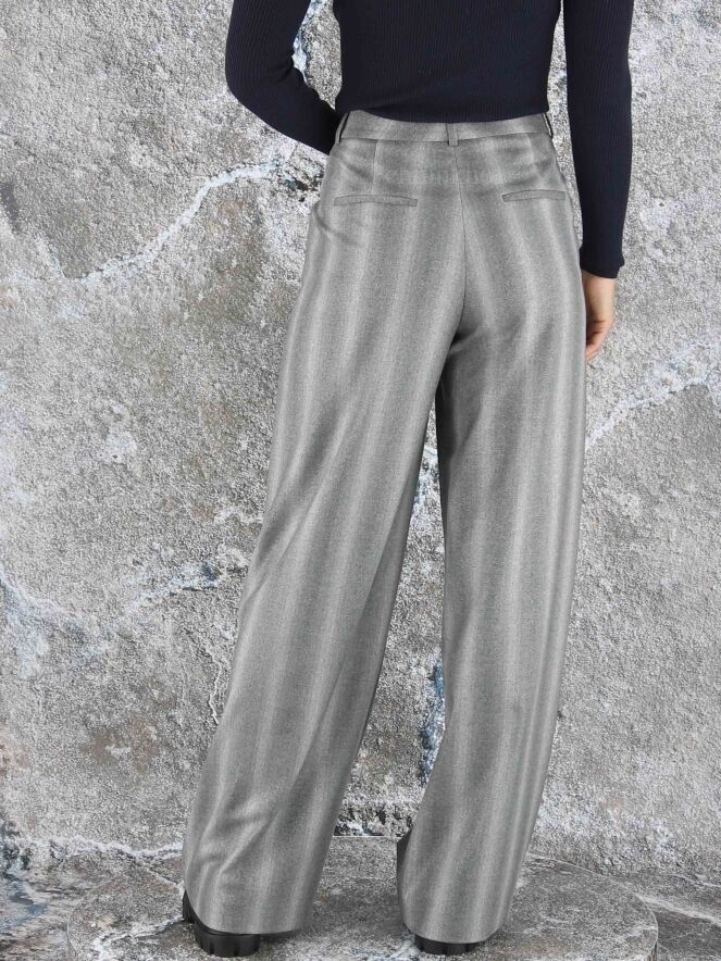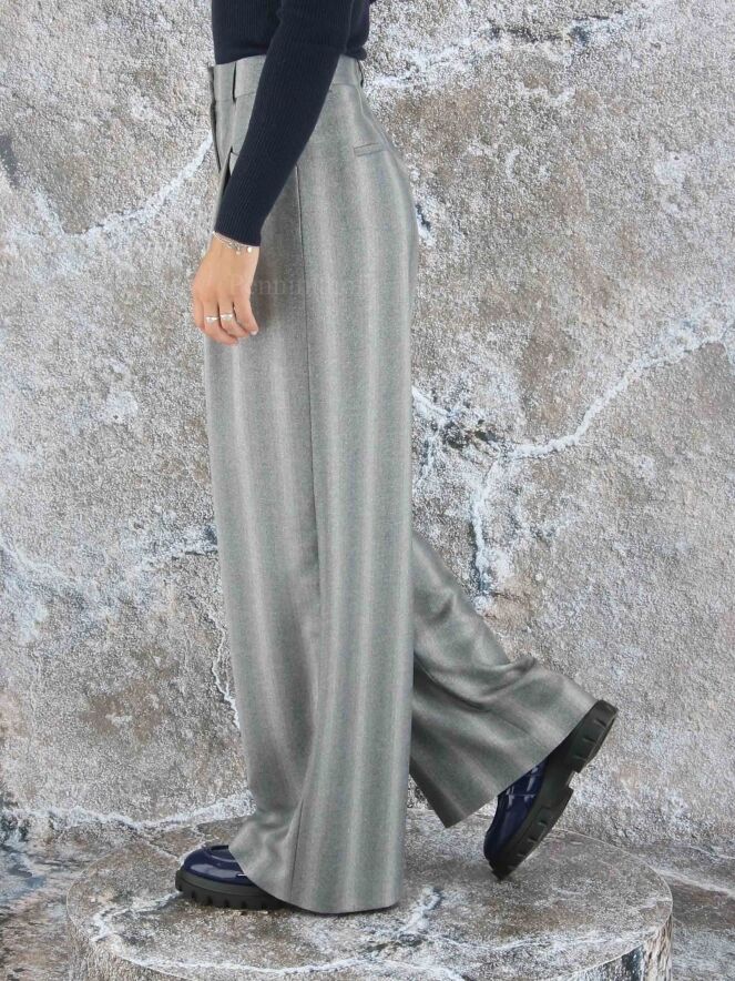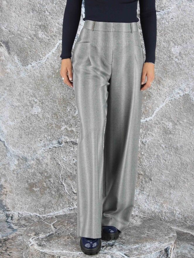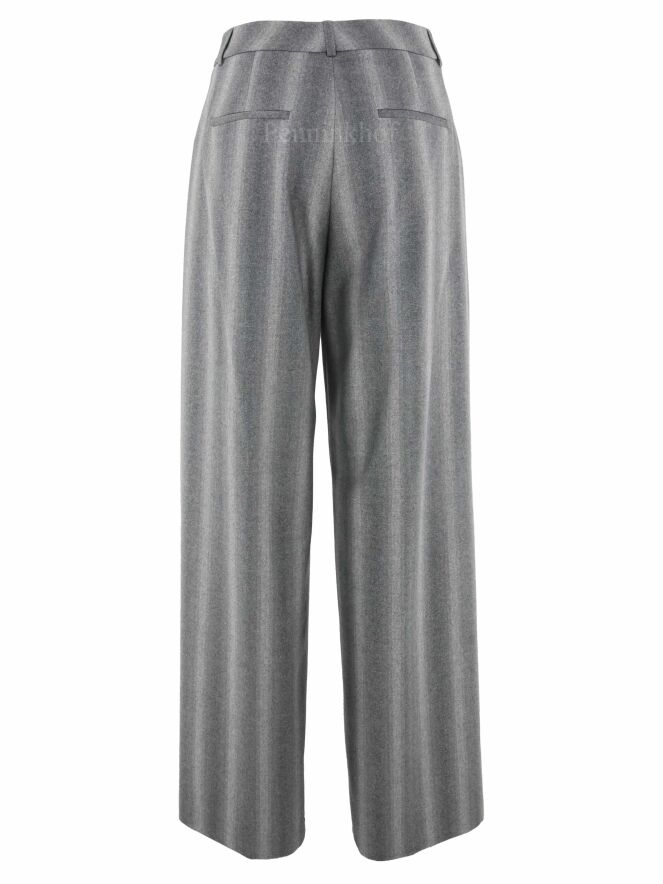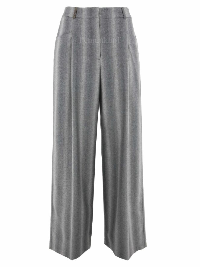 Een wijd vallende broek van Peserico in een gemêleerde strepen structuur met meerdere tinten lichtgrijs. Door de stof is een fijn zilverdraad geweven. De broek heeft 2 bandplooien die maken dat de stof van de pijpen een golvende "look" hebben. Deze broek mag niet worden gewassen.