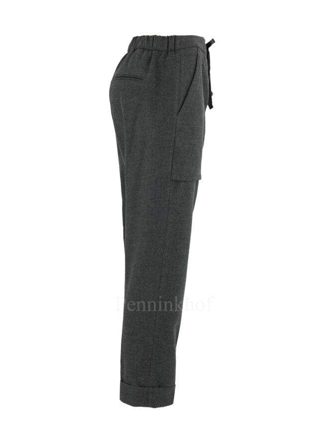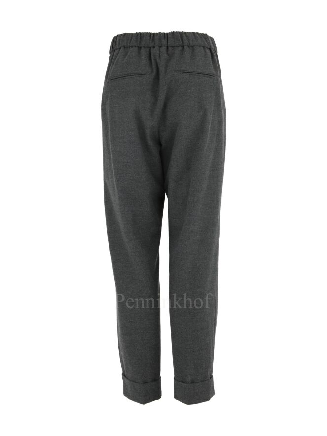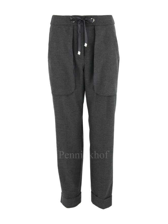 Een broek van Peserico in de kleur grijs. In de taille is aan de achterkant een elastieken band. Aan de voorzijde is een koord in een tunnelverwerking. De broek heeft steekzakken met langs de randen een verborgen mat satijnen stof. Aan de onderkant van de pijpen is een omslag. Deze broek mag op 30 graden worden gewassen.