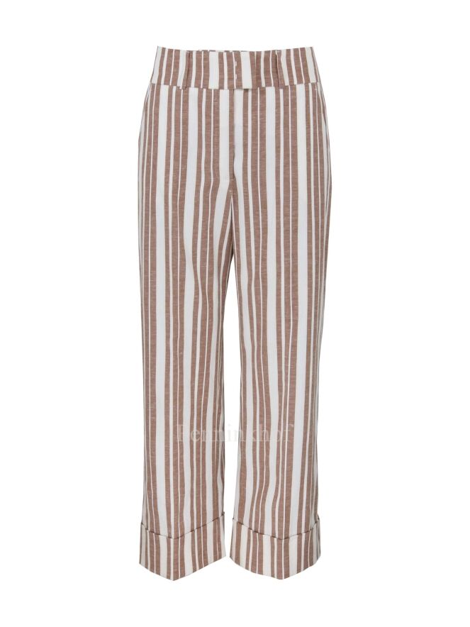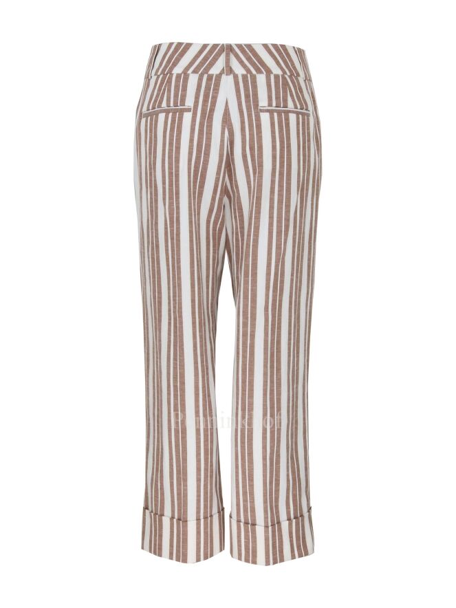 Een broek van Peserico in een strepen patroon met de kleuren pastel bruin en roomwit. De broek heeft een brede tailleband en steekzakken. Aan de onderkant van de pijpen is een brede omslag van 10 cm. deze broek mag op 30 graden worden gewassen.