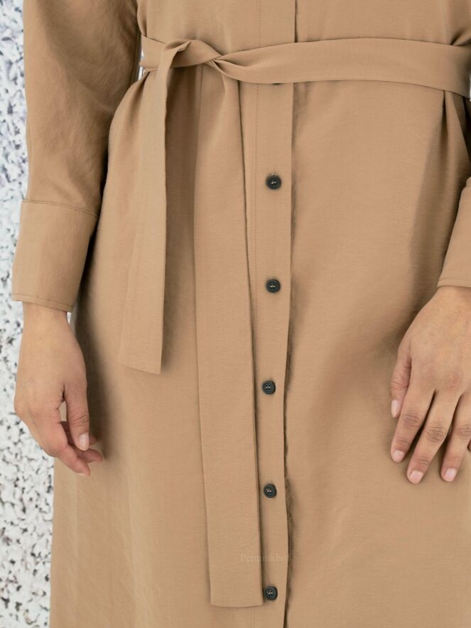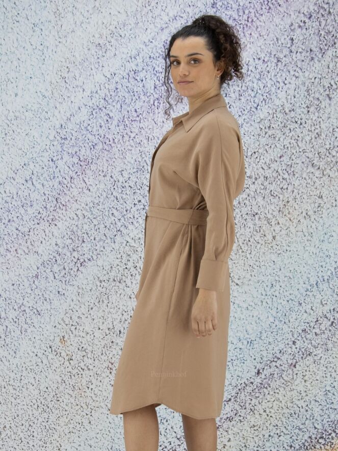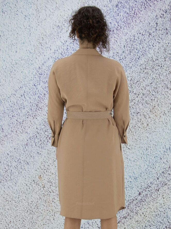 Een luxe doorknoop jurk van Peserico in een camel kleur. De jurk heeft een ceintuur met aan de voorzijde meerdere straslijnen. Deze jurk mag op de hand worden gewassen.
