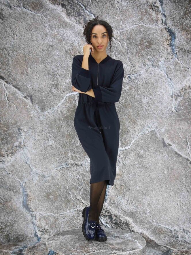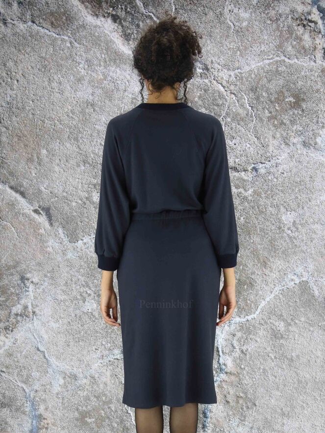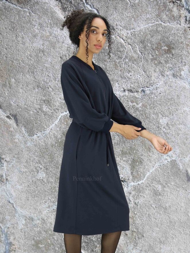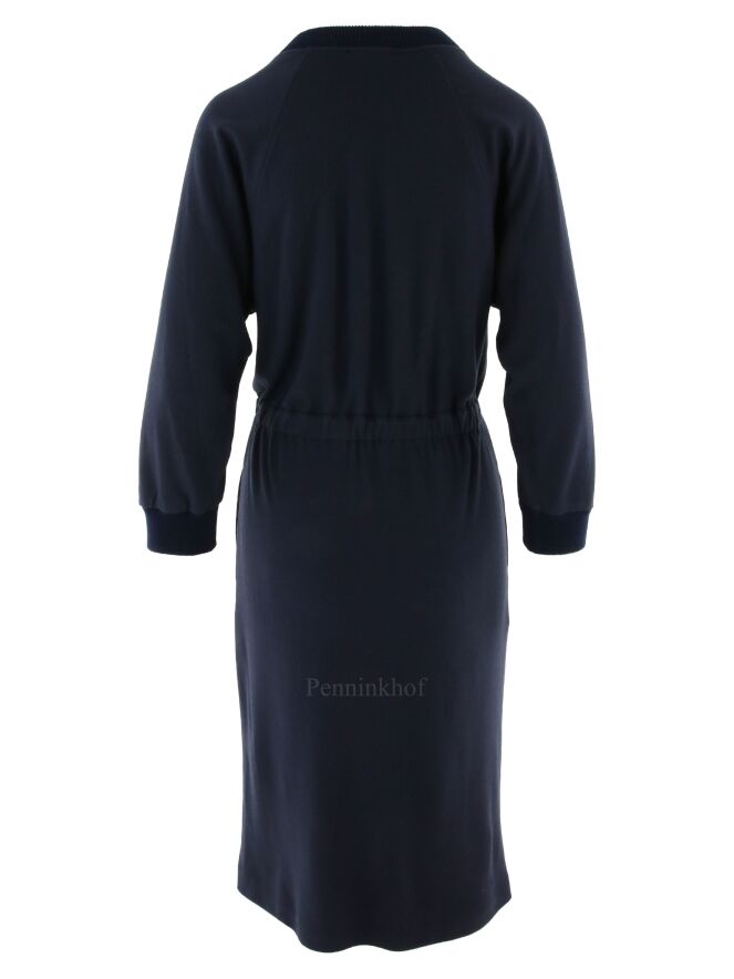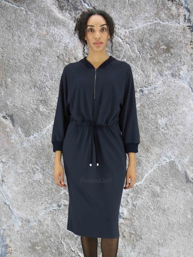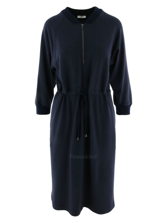 Een jurk van Peserico in de kleur marineblauw. Langs de rand van de hals is een fijn geribbelde tricot boord met in het midden aan de voorzijde een rits tot aan de buste. In de taille is een taillenaad met een koord in een tunnelverwerking waarmee een geplooid effect kan worden gecreëerd. Aan het uiteinde van de halflange mouwen is een tricot boord. Deze jurk mag op de hand worden gewassen.