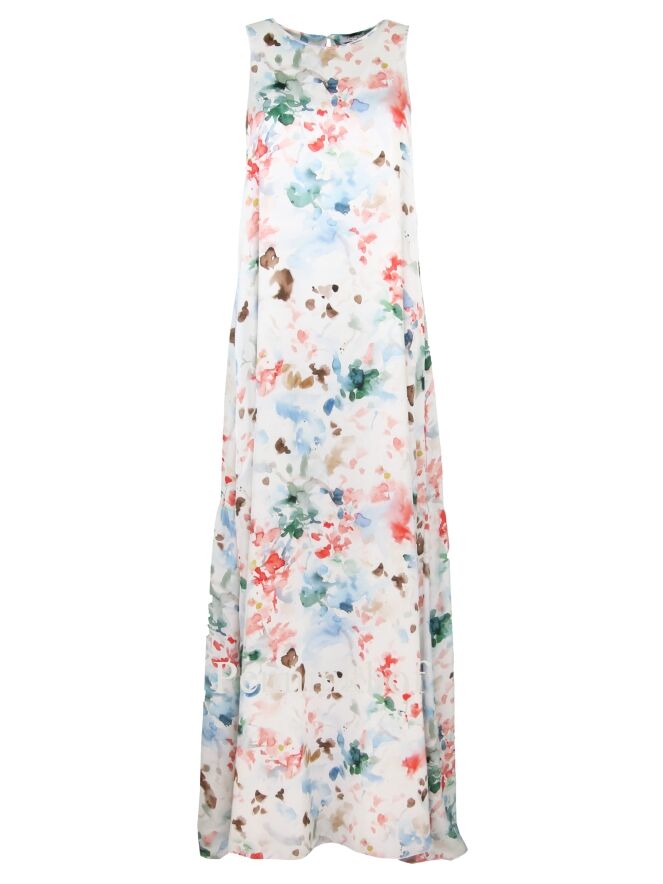 Een mat satijnen jurk van Peserico in een grafische print met de kleuren blauw, rood, groen en bruin op een witte achtergrond. De jurk heeft een ronde hals en is gevoerd. Vanuit de taille is de jurk in een A - Lijn. Aan de achterzijde is ter hoogte van de taille een smalle fijn geplooide elastieken band en ter hoogte van de heup een stiknaad. Deze jurk mag niet worden gewassen.