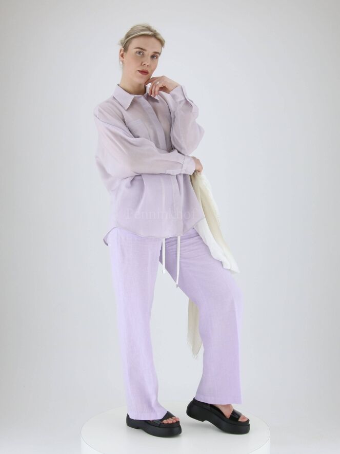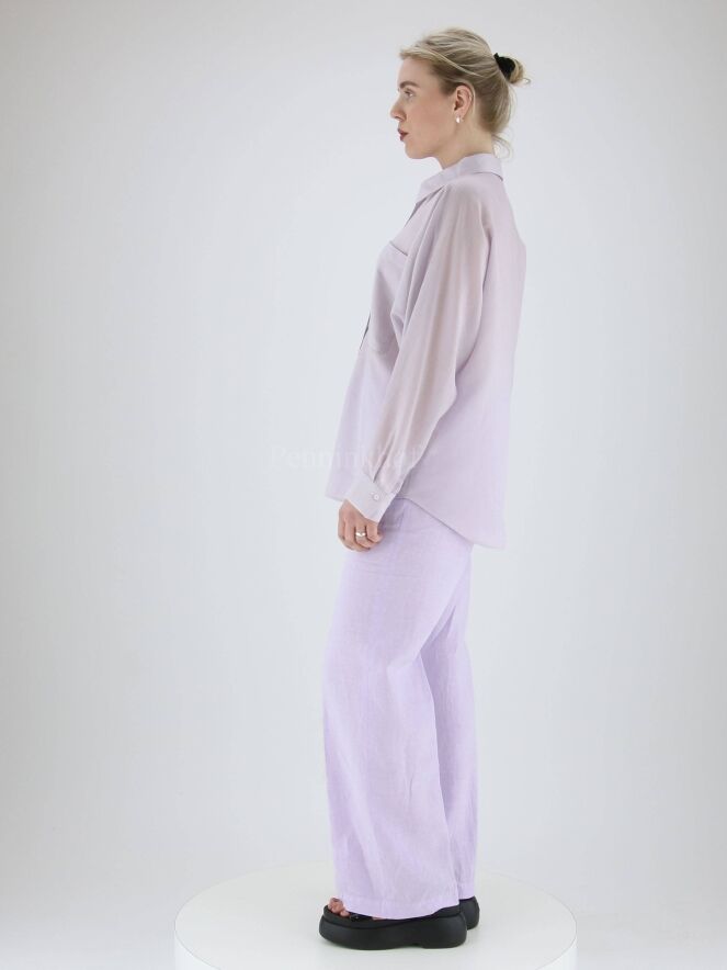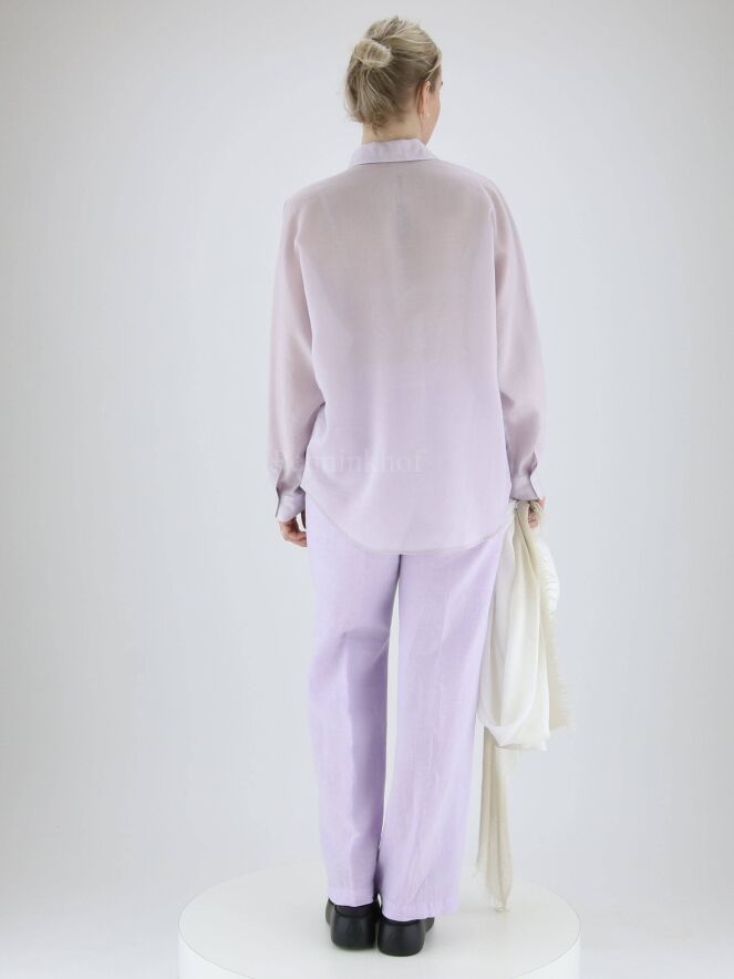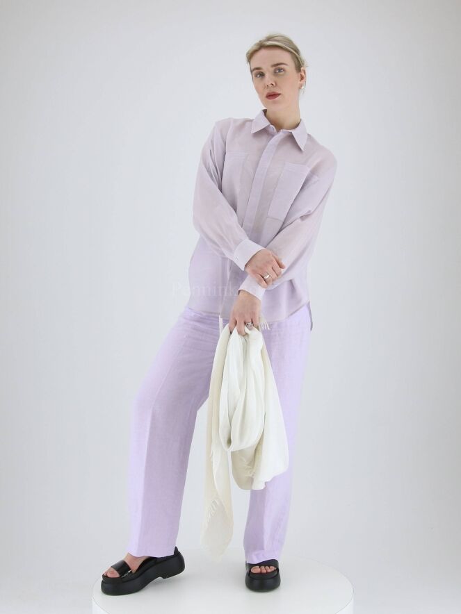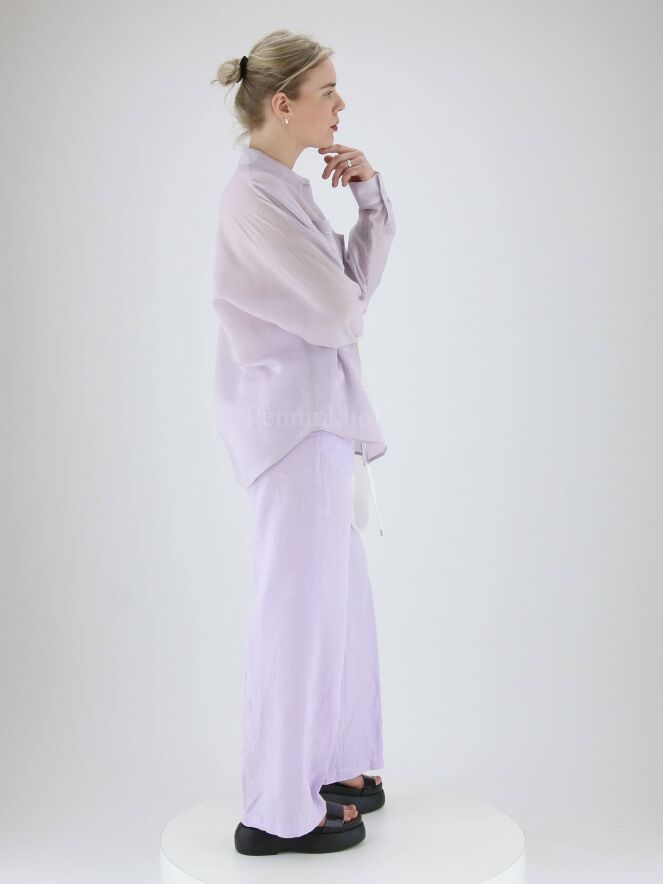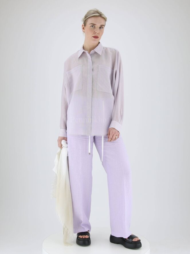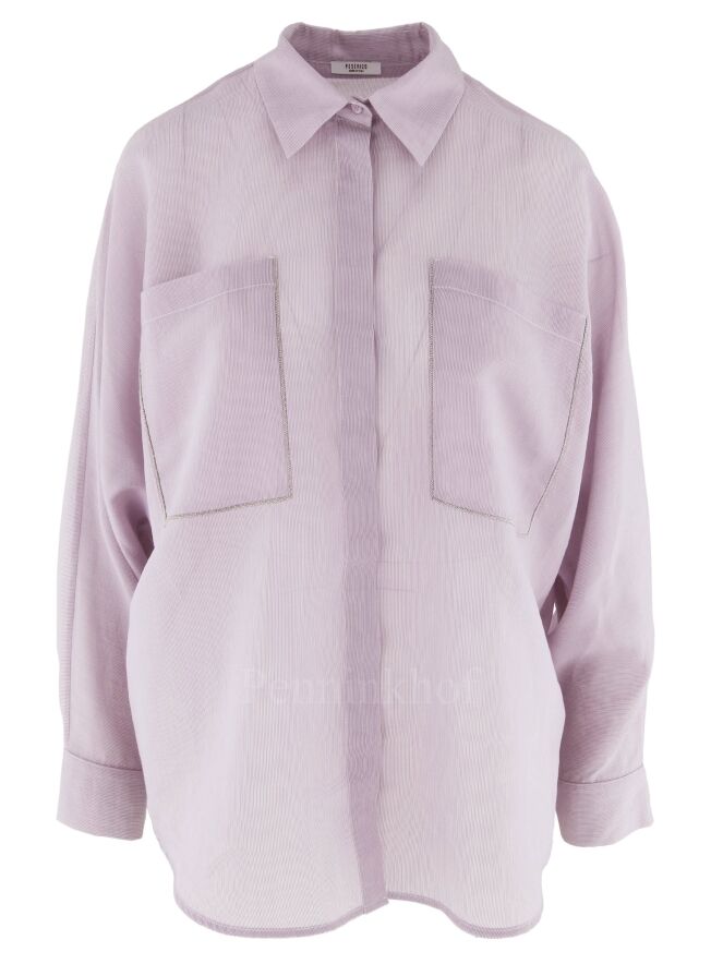 Een blouse van Peserico in een fijne verticale streep structuur met de kleuren lila en wit. De blouse heeft vleermuismouwen. Langs de rand van de borstzakken is een zilver kleurige stiknaad. Deze blouse mag op de hand worden gewassen.