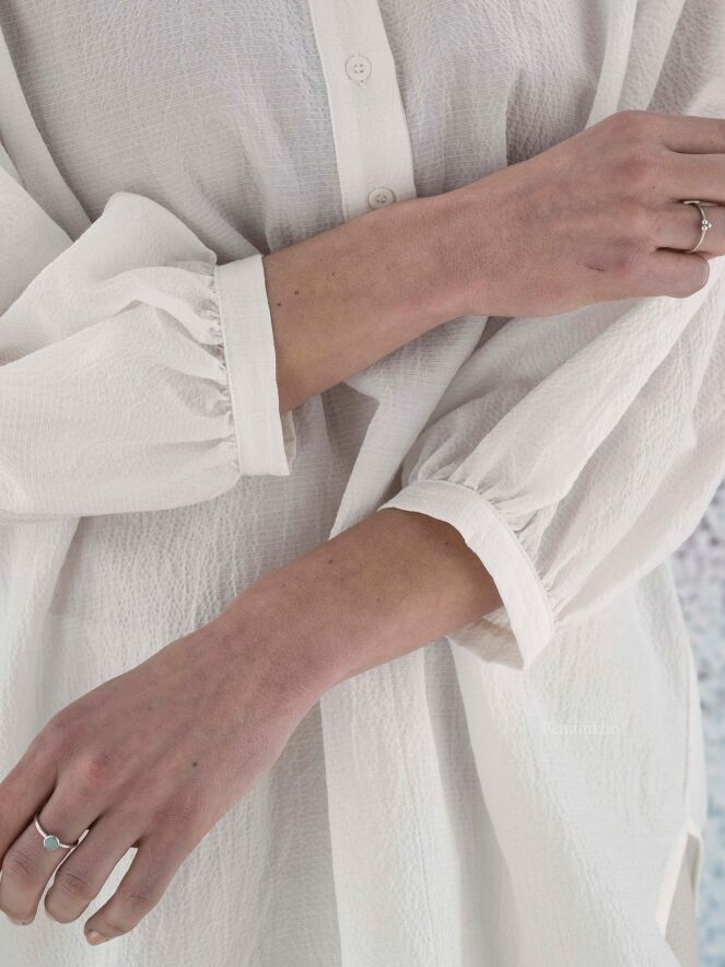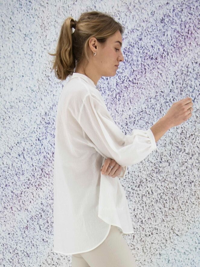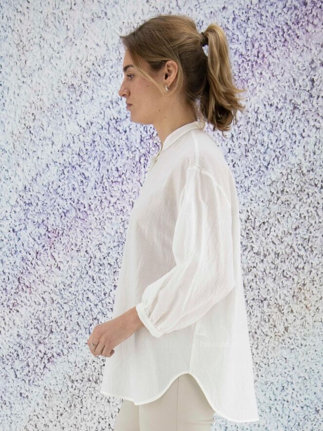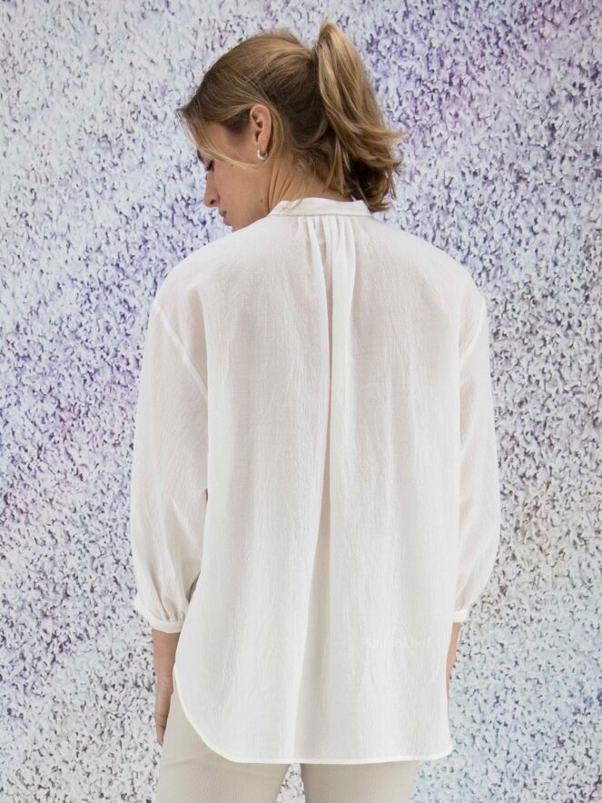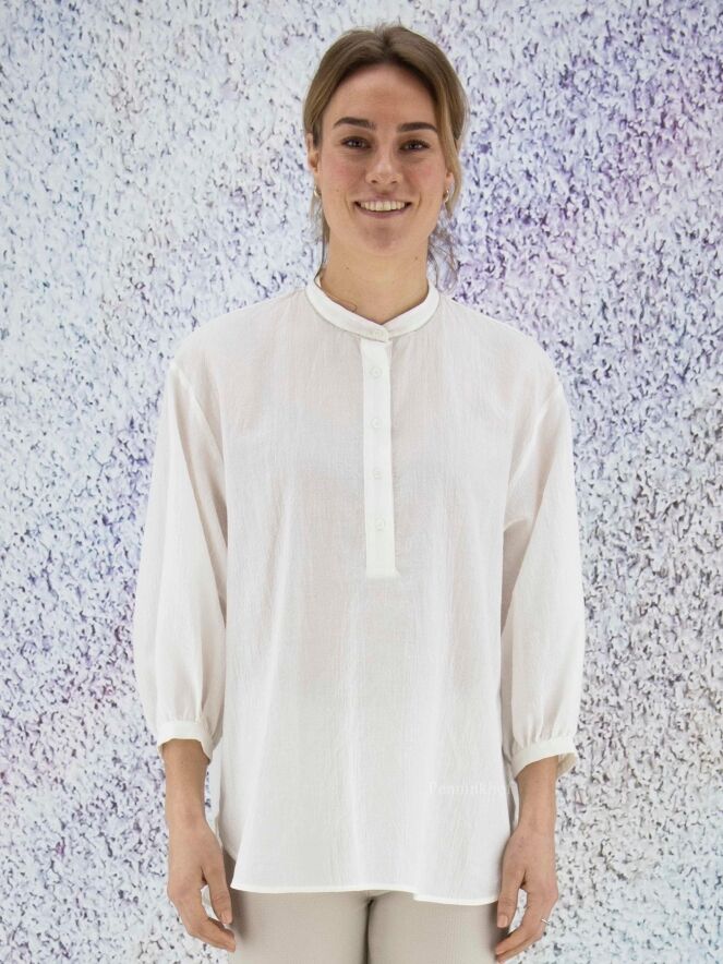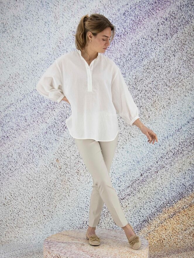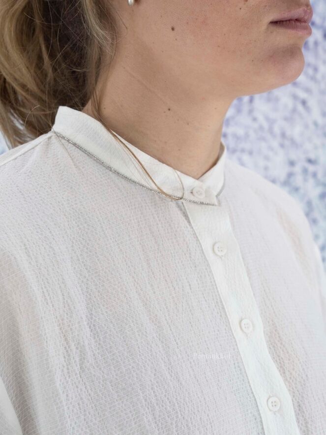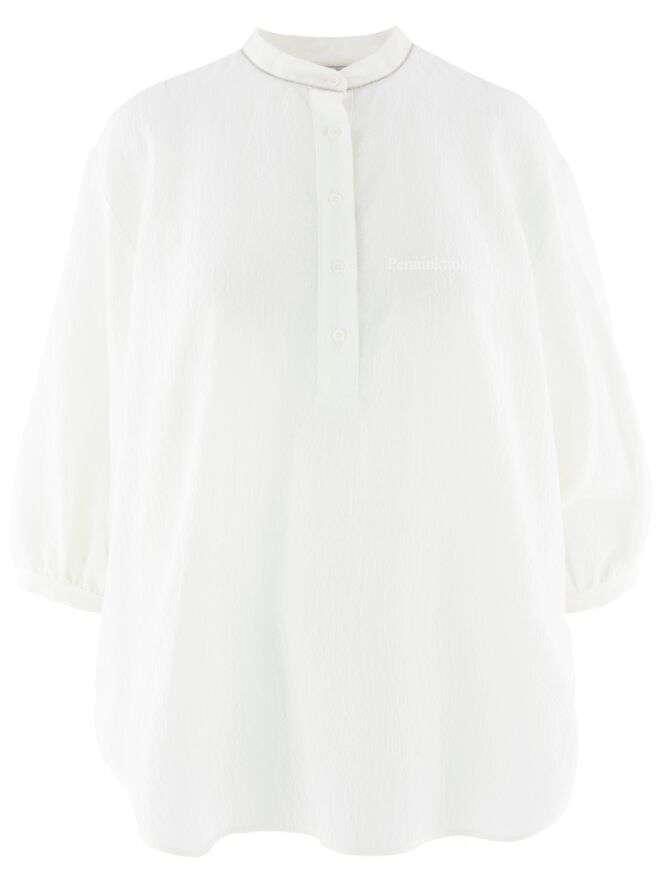 Een licht transparante blouse van Peserico in een fijn geribbelde structuur in een roomwitte kleur. Langs de ronde hals is een strass bies. De blouse heeft halflange mouwen en mag niet worden gewassen.