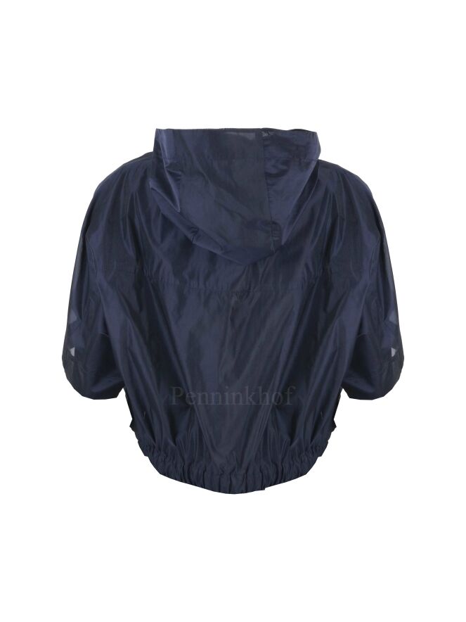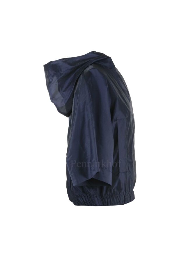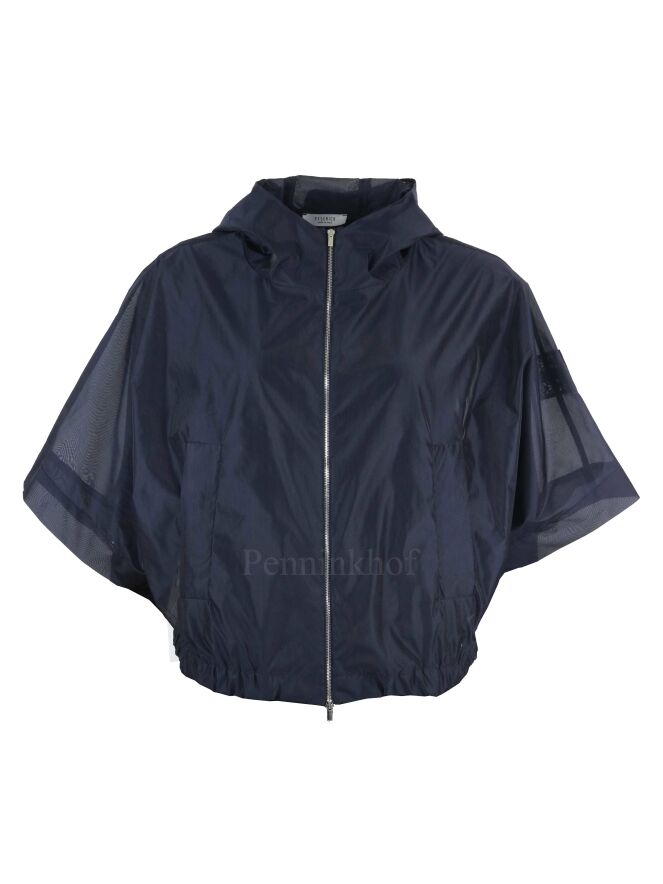 Een transparant vest van Peserico in de kleur marineblauw. He vest heeft een capuchon, vleermuismouwen en steekzakken. Aan de onderkant is een fijn geplooide elastieken boord. Dit vest mag niet worden gewassen.