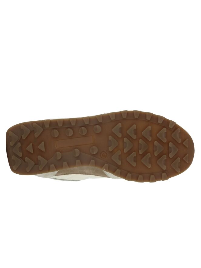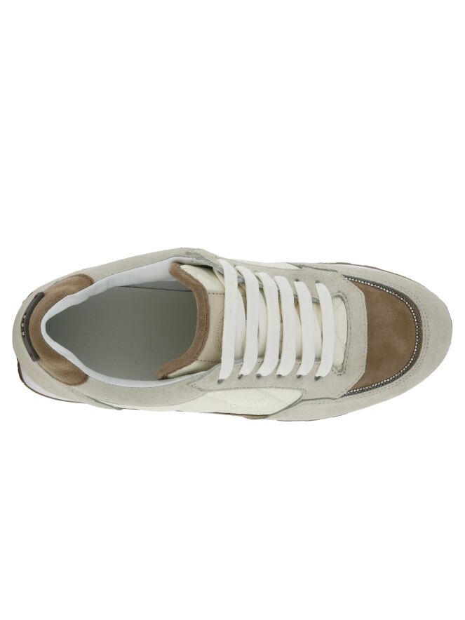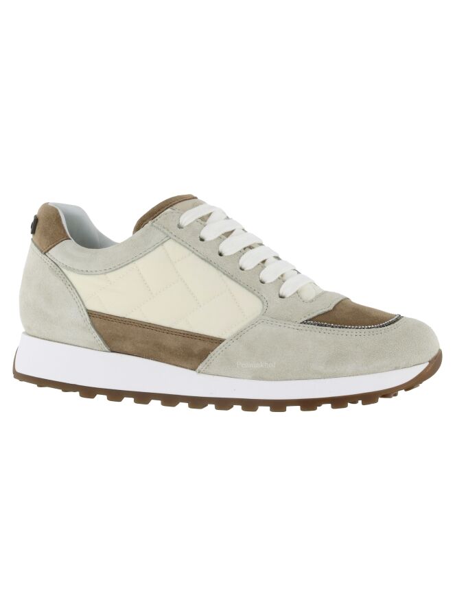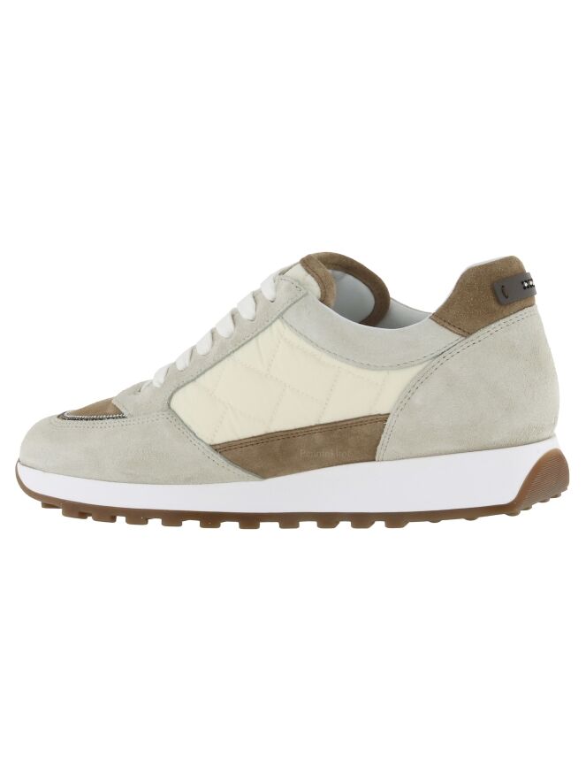 Een sneaker van Peserico in de kleuren roomwit met beige en lichtbruin. Op de voorvoet is een lichtbruin vlak suède wat terugkomt op de hiel en de rand van de tong. Langs de zijkanten is een gewatteerde roomwitte parachute stof. De zool is in de kleur wit. De binnenkant is met leder gevoerd.