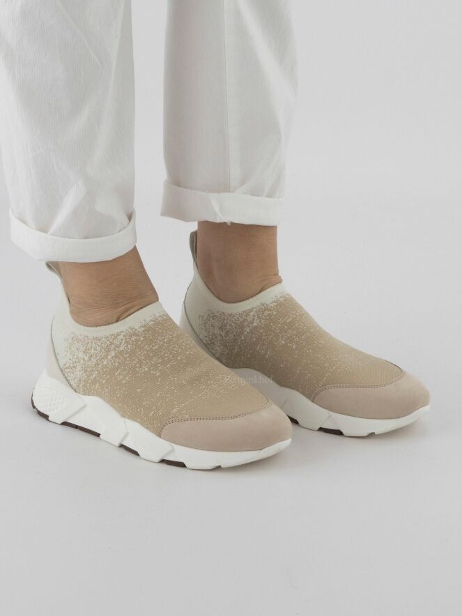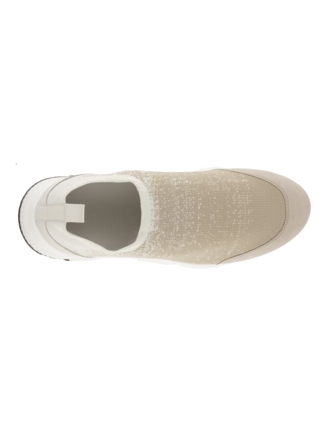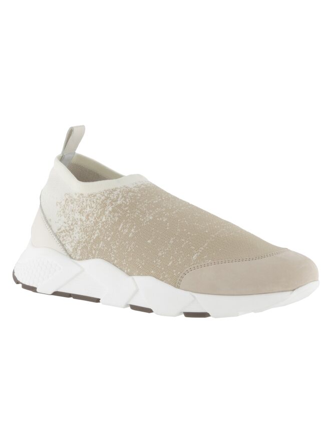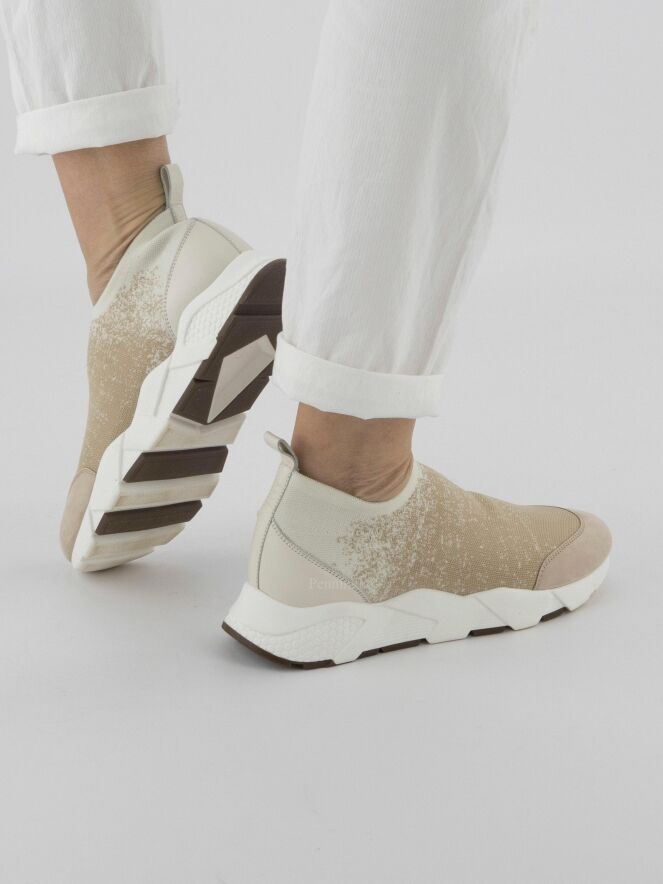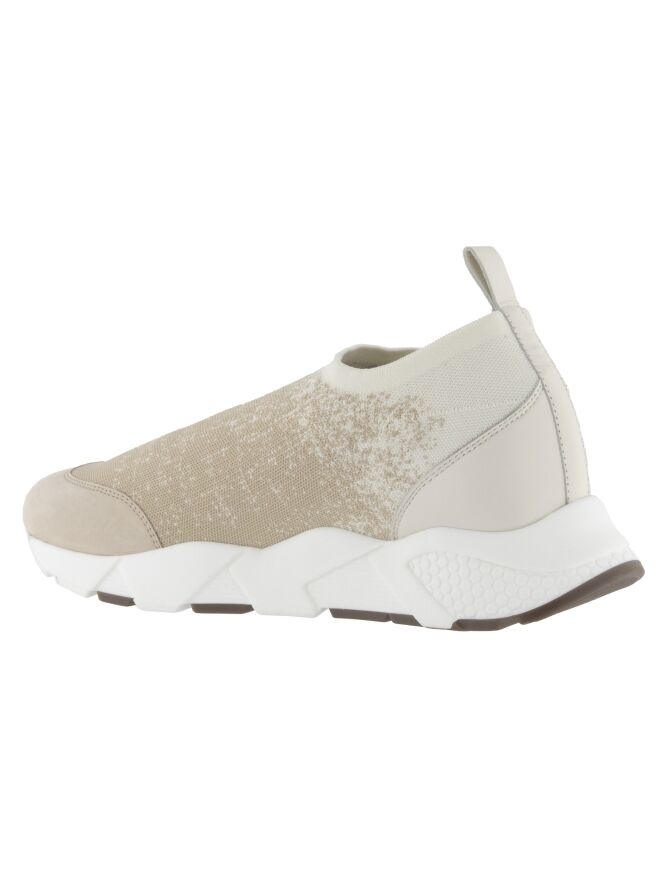 Een sneaker van Peserico in een elastische stof met een dégradé print met de kleuren beige en roomwit. De design zool is in een witte kleur.