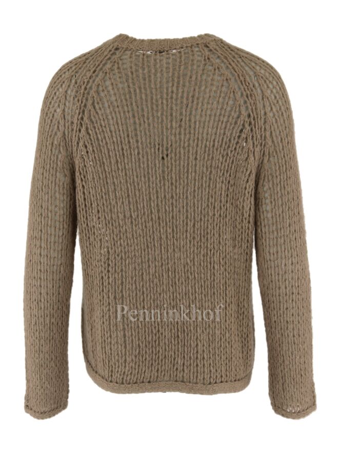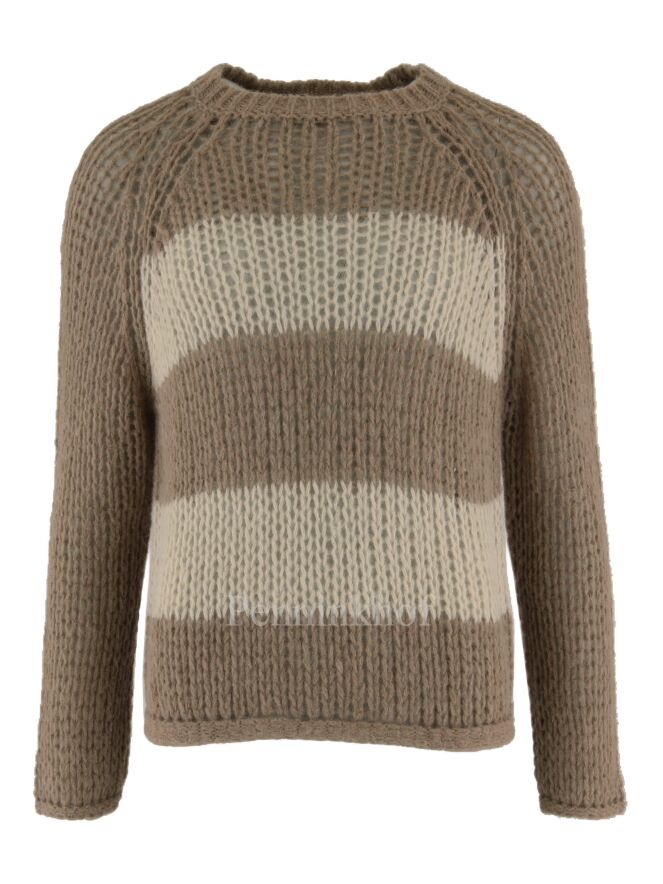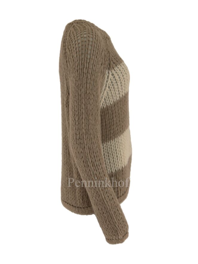 Een open gebreide pullover van Peserico met aan de voorzijde een strepen patroon met de kleuren roomwit en camel. De achterzijde en de mouwen zijn in een uni camel kleur. De pullover heeft een ronde hals en mag op de hand worden gewassen.