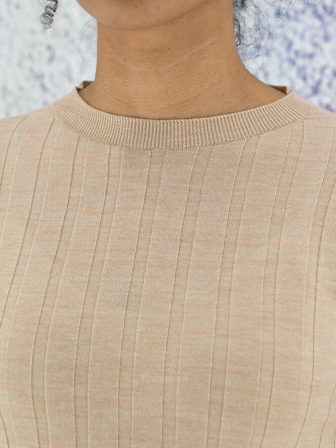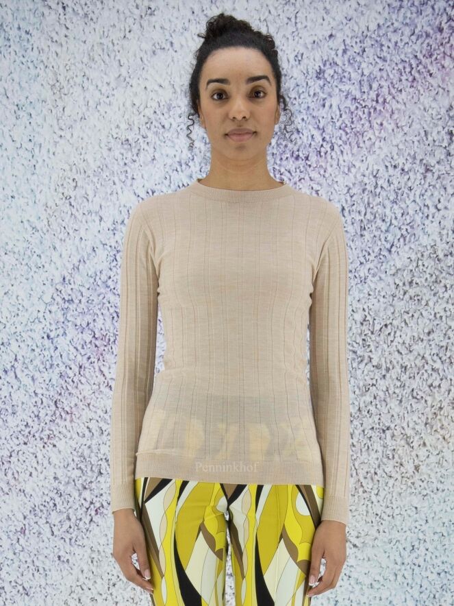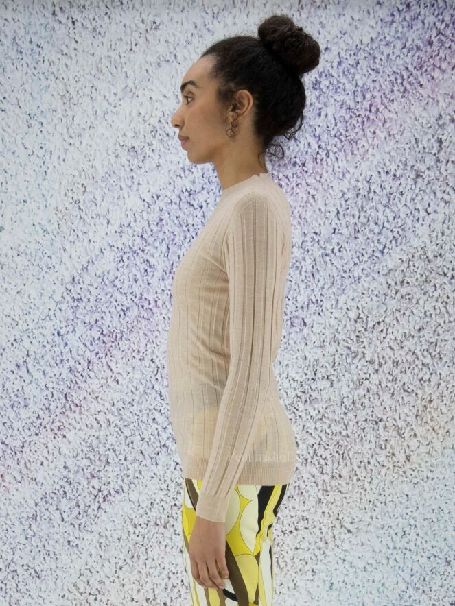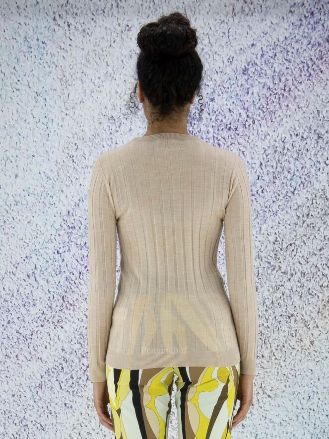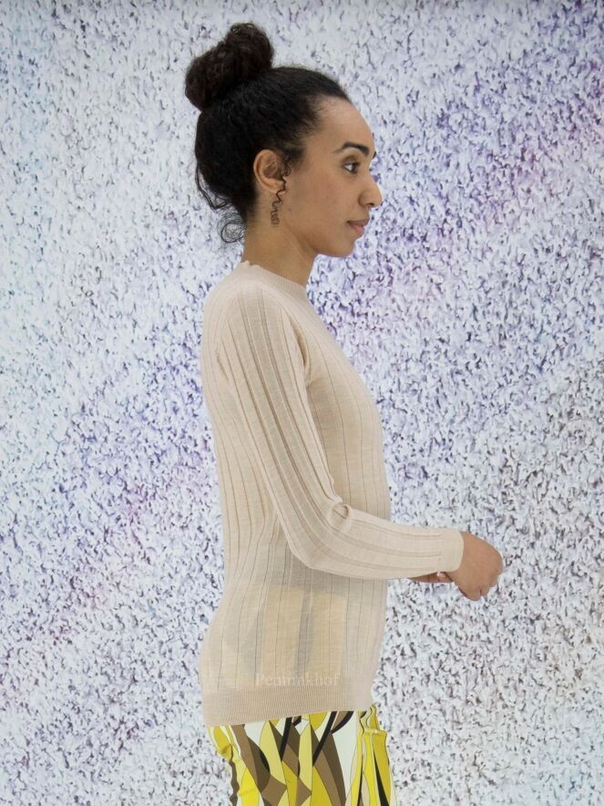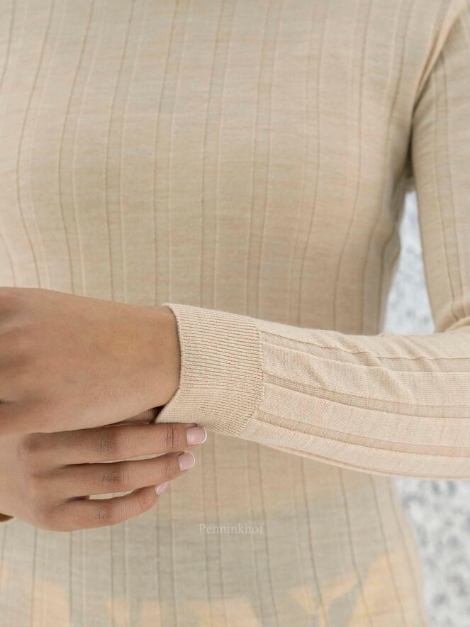 Een lichte pullover van Peserico in een beige kleur. De stof is in een ribbel structuur. De pullover heeft een hoge hals en lange mouwen en mag op de hand worden gewassen.