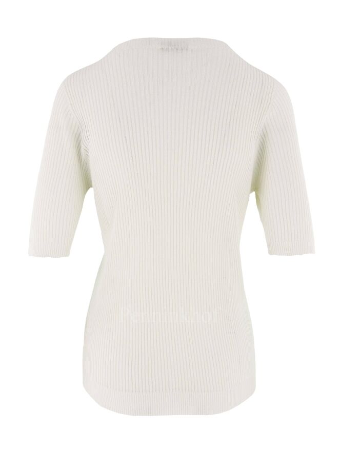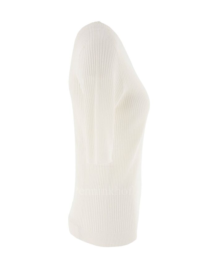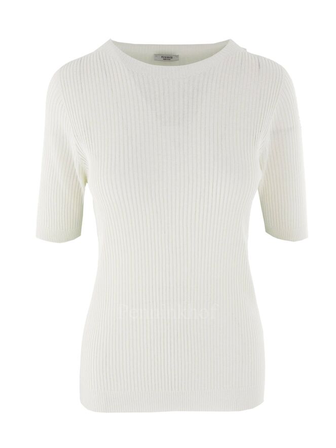 Een luxe shirt van Peserico in een ribbel patroon in de kleur beige. Het shirt heeft een ronde hals en korte mouwen. Dit shirt mag op de hand worden gewassen.