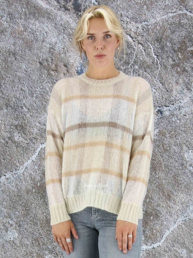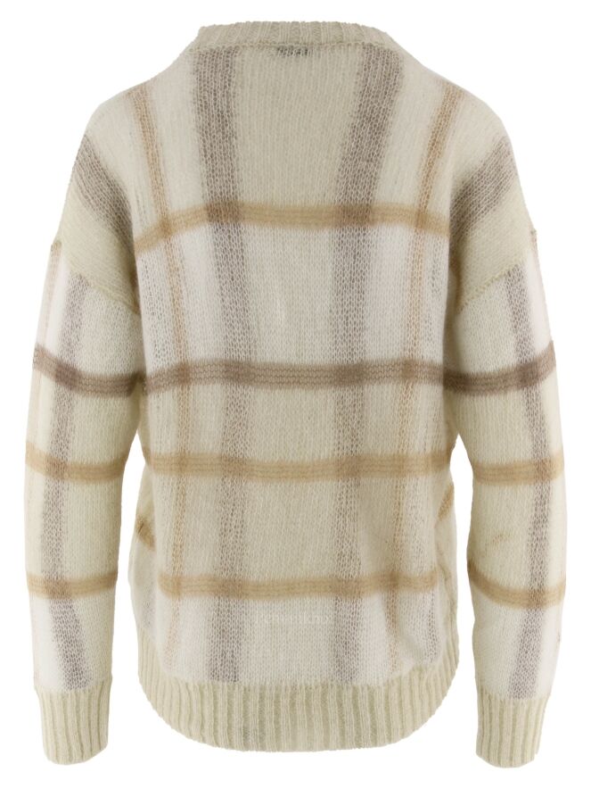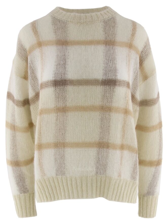 Een pullover van Peserico in een open structuur gebreid in een ruitpatroon met de kleuren camel, bruin en roomwit. Langs de ronde hals, de onderkant van de pullover en de uiteinden van de lange mouwen is een geribbelde tricot boord. Deze pullover mag op de hand worden gewassen.