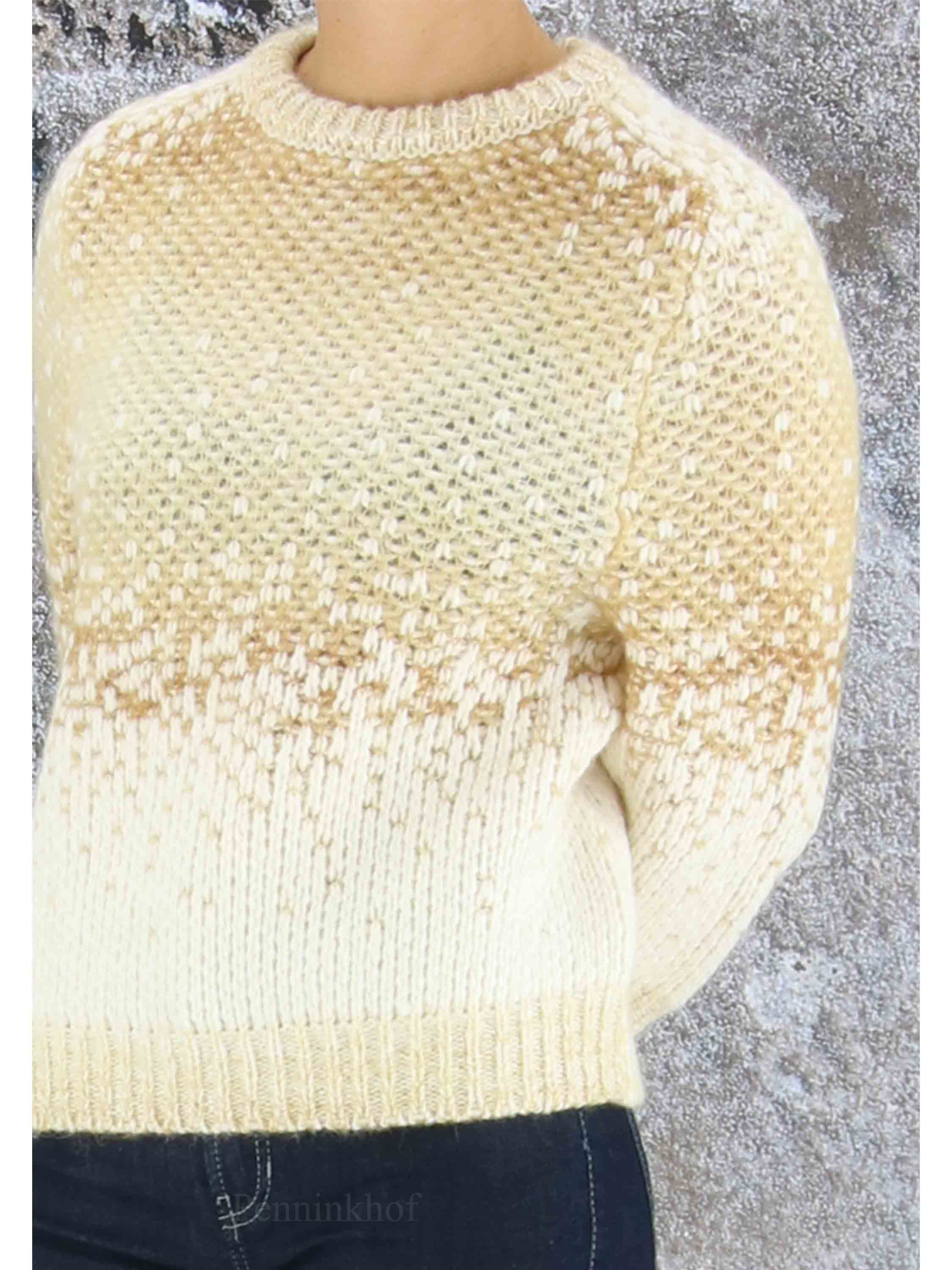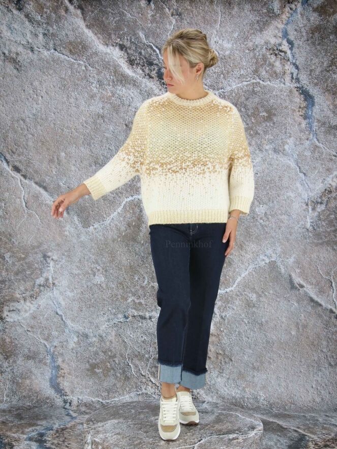 Een luxe pullover in een dégradé print met de kleuren camel en roomwit. De pullover heeft een hoge ronde hals en halflange mouwen. Deze pullover mag op de hand worden gewassen.