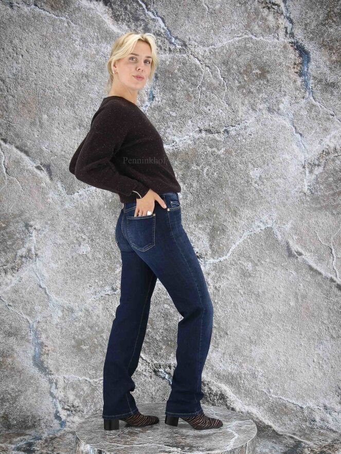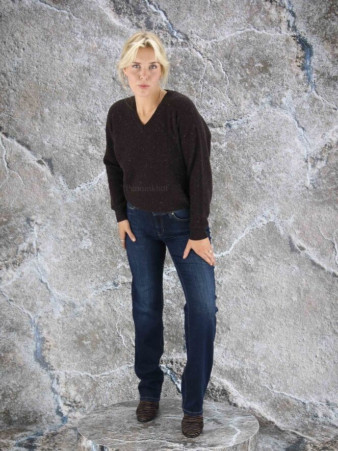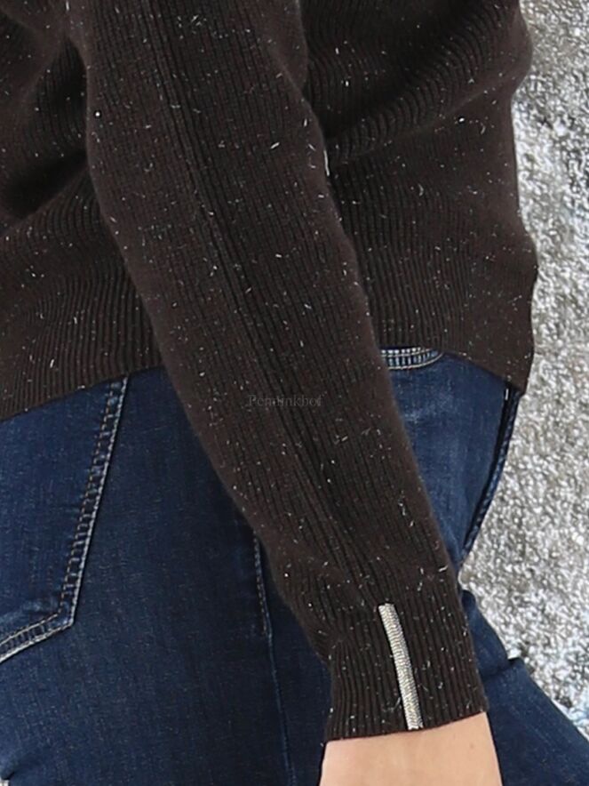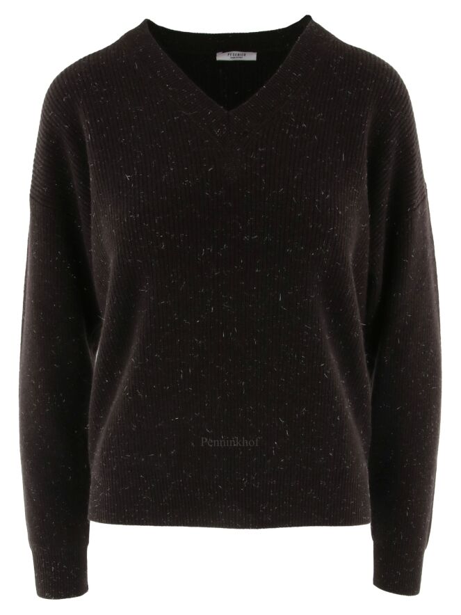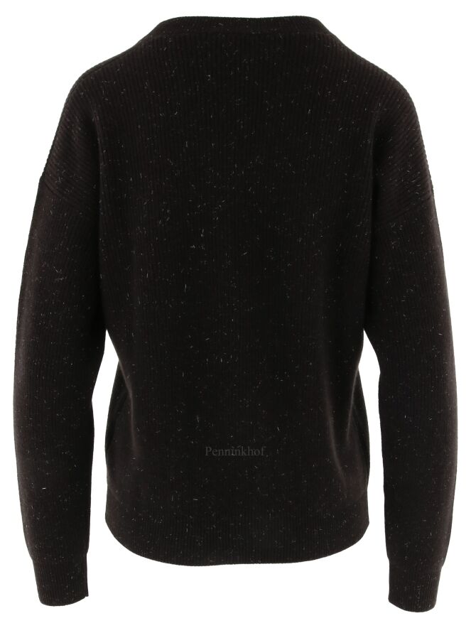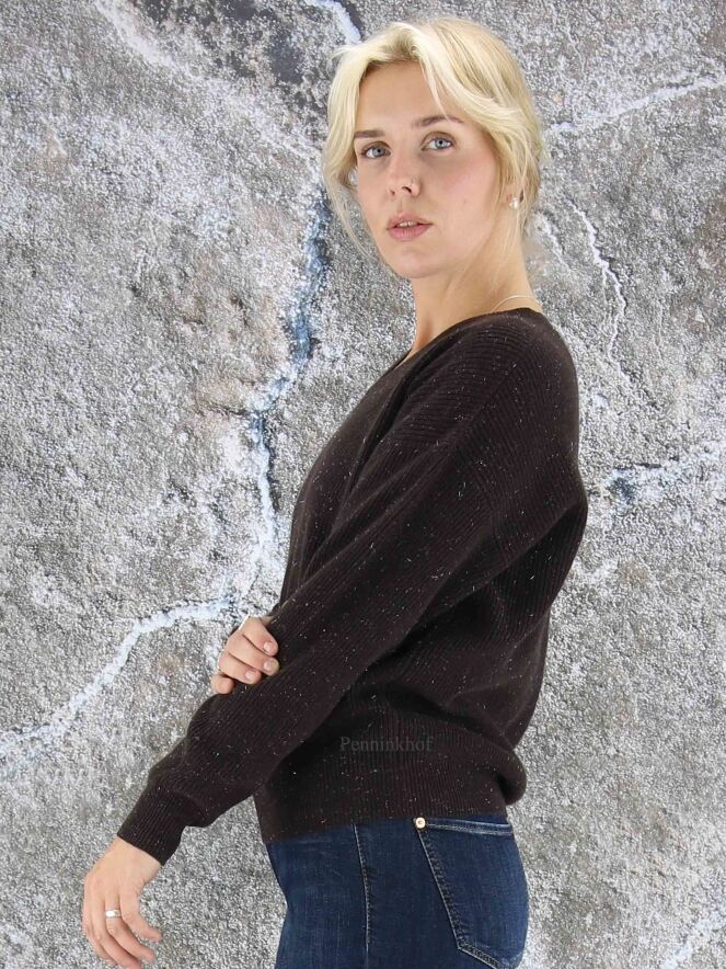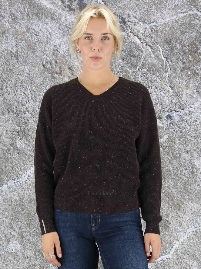 Een pullover van Peserico in een fijne patentsteek gebreid in een mokka bruine kleur. Door de stof is een zilverdraad geweven. De pullover heeft een V - Hals en mag op de hand worden gewassen.