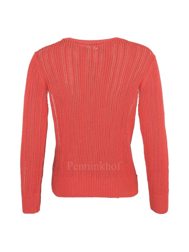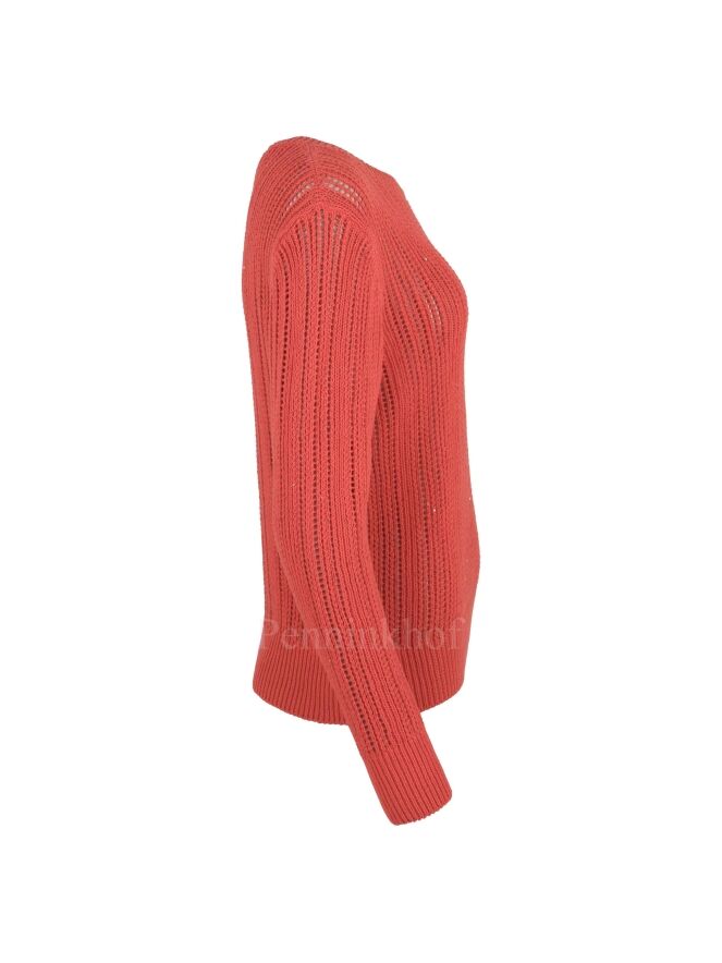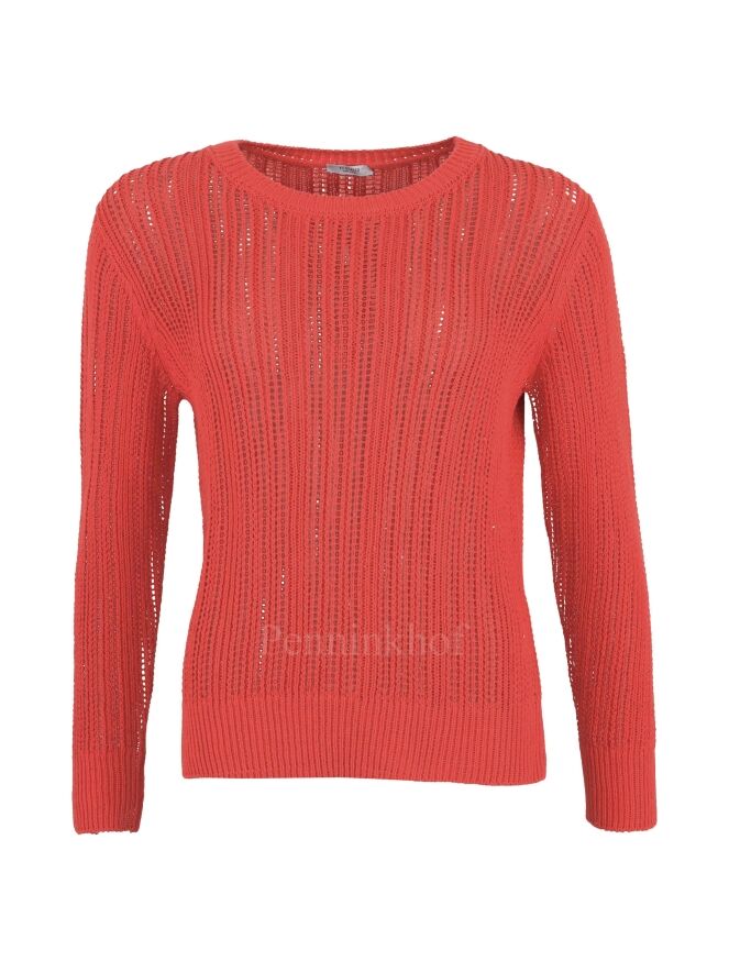 Een open gebreide pullover van Peserico in de kleur koraalrood. In de stof zijn lovertjes verwerkt in dezelfde kleur als de stof. Aan de onderkant en aan het uiteinde van de lange mouwen is een tricot boord. Deze pullover mag op de hand worden gewassen.
