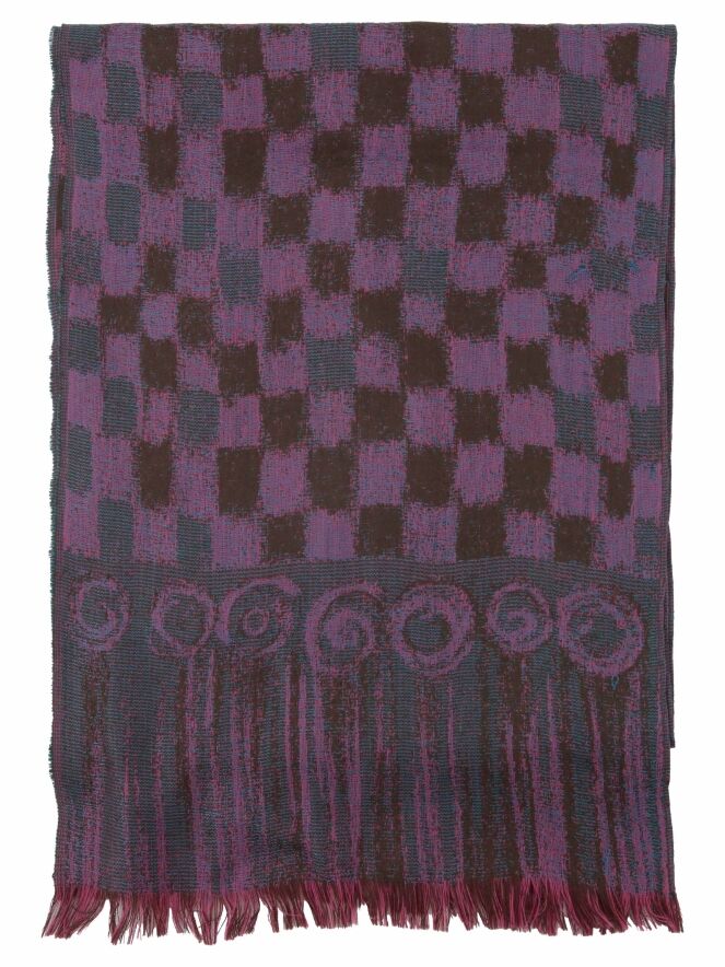Een shawl van Petrusse in een blok print met de kleuren paars, blauw en mokkabruin. De uiteinden van de shawl zijn fijn gerafeld. Deze shawl mag niet worden gewassen.