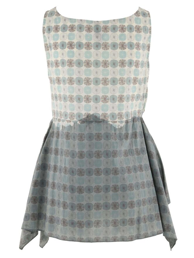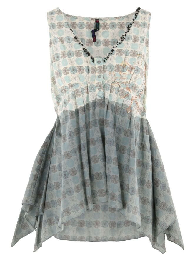 Een top van Pianura Studio in een bloemetjes print. Tot aan de taille is de print in meerdere tinten mintgroen op een roomwitte achtergrond. Vanaf de taille is de hoofdkleur grijs. Aan de linkerkant van de voorzijde zijn meerere studs in een patroon van een zon. Langs de rand van de V - Hals zijn zwarte stiksels en kraaltjes. Deze top mag niet worden gewassen.