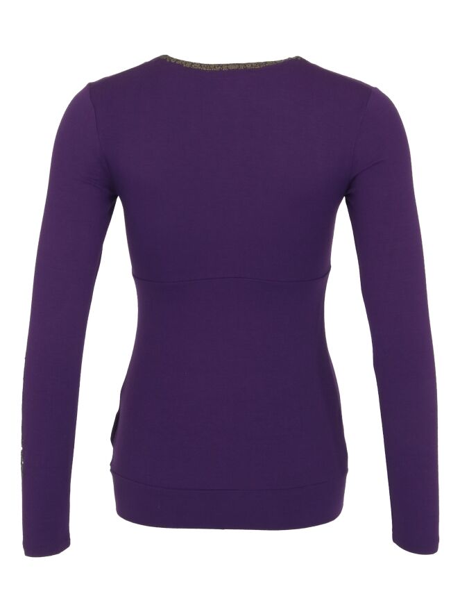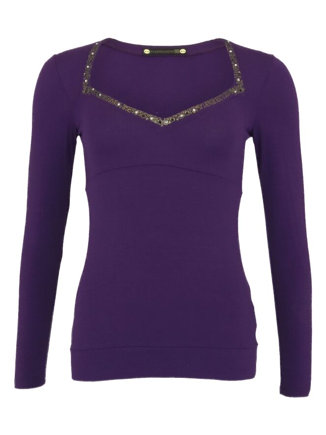 Een shirt van Pianura Studio in de kleur paars. Langs de rand van de hals belijning is een bies in een brons kleurige barokprint met strassteentjes. Dit shirt mag op 30 graden worden gewassen.